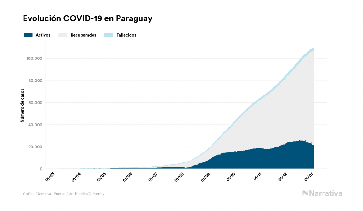 La COVID-19 deja ya 109.073 casos de contagio en Paraguay, con 21.944 de ellos actualmente activos y 2.292 fallecidos, según los últimos datos correspondientes al 4 de enero. Además, un total de 84.837 personas ya se ha recuperado desde que se produjo el primer contagio en el país.