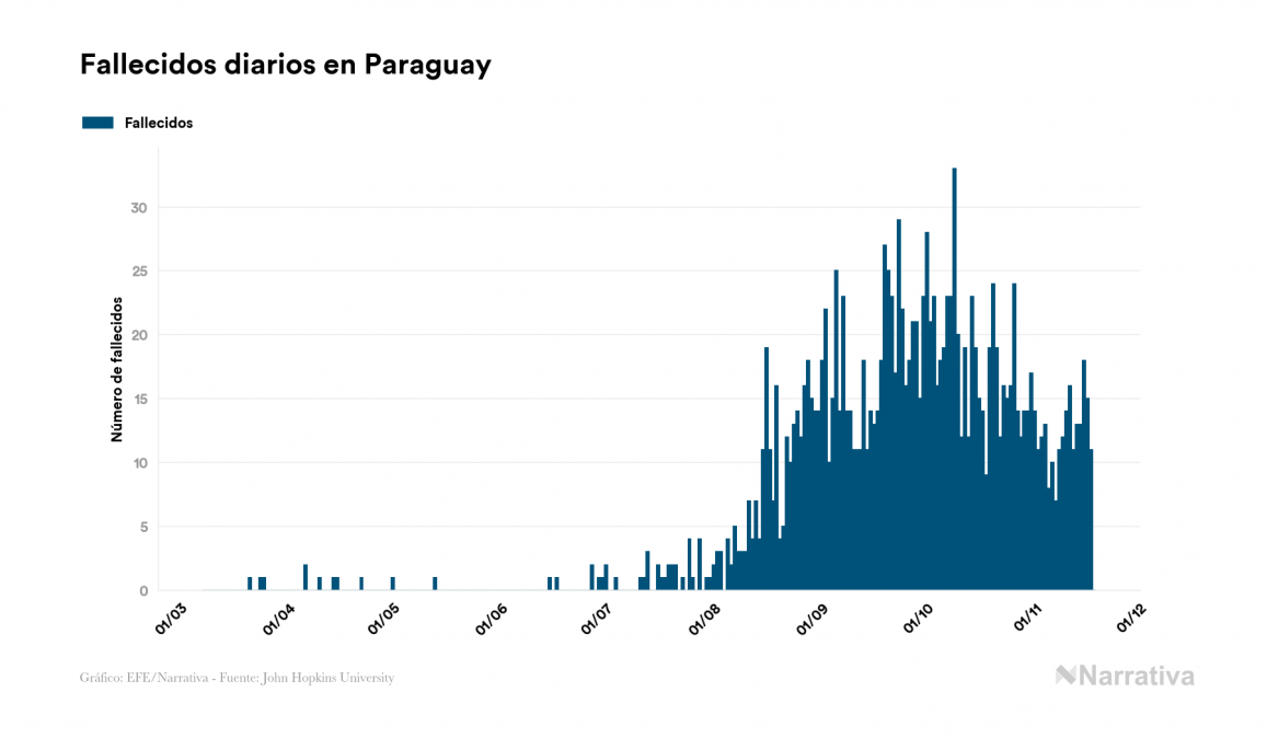 El coronavirus deja ya 72.857 casos de contagio en Paraguay, con 19.062 de ellos actualmente activos y 1.613 fallecidos, según los últimos datos correspondientes al 18 de noviembre. Además, un total de 52.182 personas ya se ha recuperado desde que se produjo el primer contagio en el país.