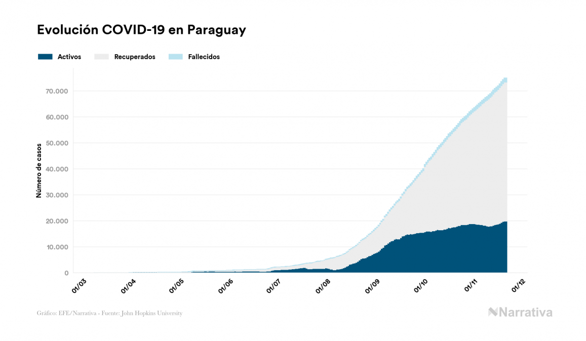 El nuevo coronavirus deja ya 75.058 casos de contagio en Paraguay, con 19.909 de ellos actualmente activos y 1.647 fallecidos, según los últimos datos correspondientes al 21 de noviembre. Además, un total de 53.502 personas ya se ha recuperado desde que se produjo el primer contagio en el país.
