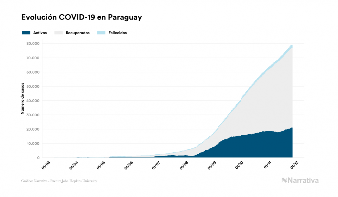 El coronavirus deja ya 78.878 casos de contagio en Paraguay, con 21.162 de ellos actualmente activos y 1.691 fallecidos, según los últimos datos correspondientes al 26 de noviembre. Además, un total de 56.025 personas ya se ha recuperado desde que se produjo el primer contagio en el país.