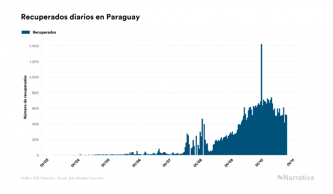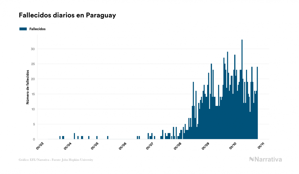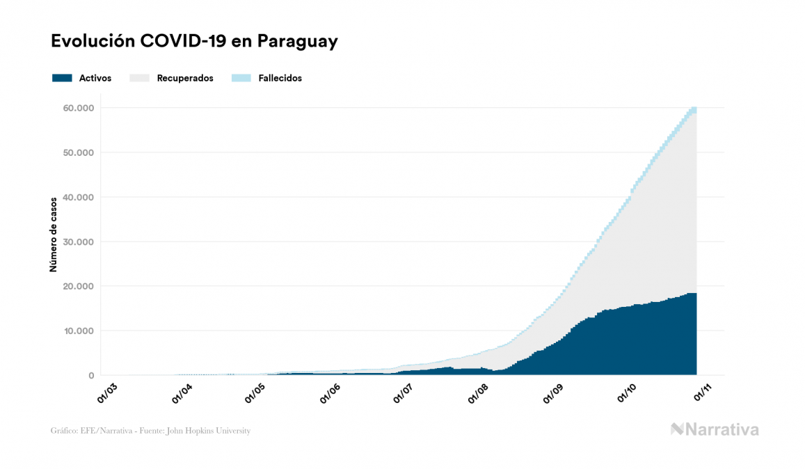 El nuevo coronavirus deja ya 60.109 casos de contagio en Paraguay, con 18.529 de ellos actualmente activos y 1.333 fallecidos, según los últimos datos correspondientes al 27 de octubre. Además, un total de 40.247 personas ya se ha recuperado desde que se produjo el primer contagio en el país.
