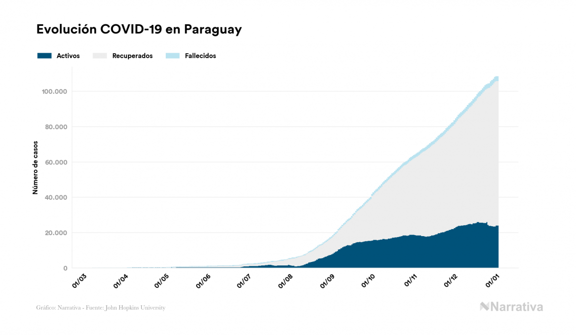 El nuevo coronavirus deja ya 108.349 casos de contagio en Paraguay, con 24.110 de ellos actualmente activos y 2.262 fallecidos, según los últimos datos correspondientes al 2 de enero. Además, un total de 81.977 personas ya se ha recuperado desde que se produjo el primer contagio en el país.