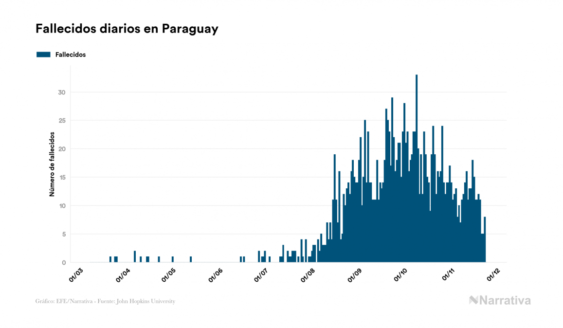 El nuevo coronavirus deja ya 77.072 casos de contagio en Paraguay, con 20.361 de ellos actualmente activos y 1.665 fallecidos, según los últimos datos correspondientes al 24 de noviembre. Además, un total de 55.046 personas ya se ha recuperado desde que se produjo el primer contagio en el país.