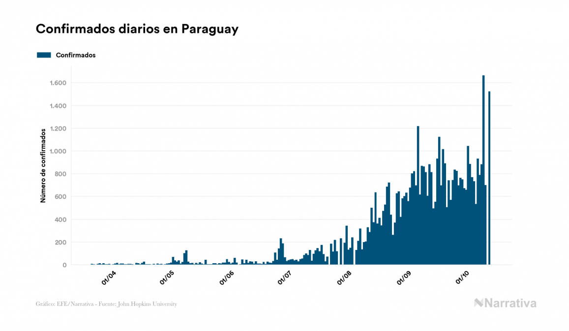 El coronavirus deja ya 51.197 casos de contagio en Paraguay, con 16.764 de ellos actualmente activos y 1.108 fallecidos, según los últimos datos correspondientes al 14 de octubre. Además, un total de 33.325 personas ya se ha recuperado desde que se produjo el primer contagio en el país.