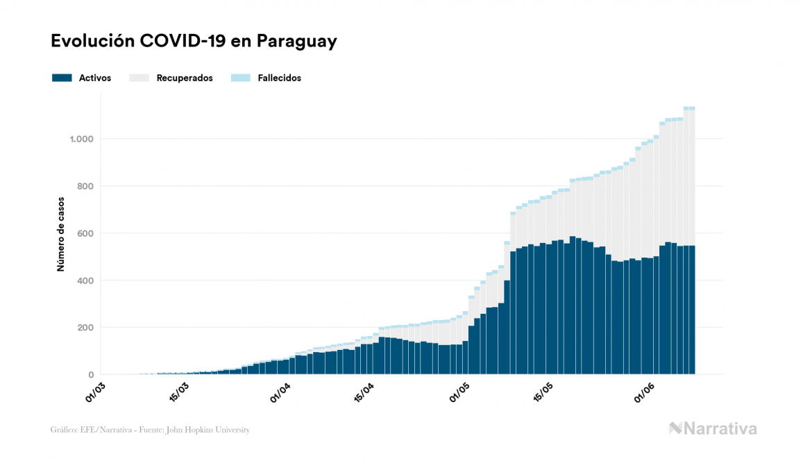 La COVID-19 deja ya 1.135 casos de contagio en Paraguay, con 549 de ellos actualmente activos y 11 fallecidos, según los últimos datos correspondientes al 8 de junio. Además, un total de 575 personas ya se ha recuperado desde que se produjo el primer contagio en el país.
