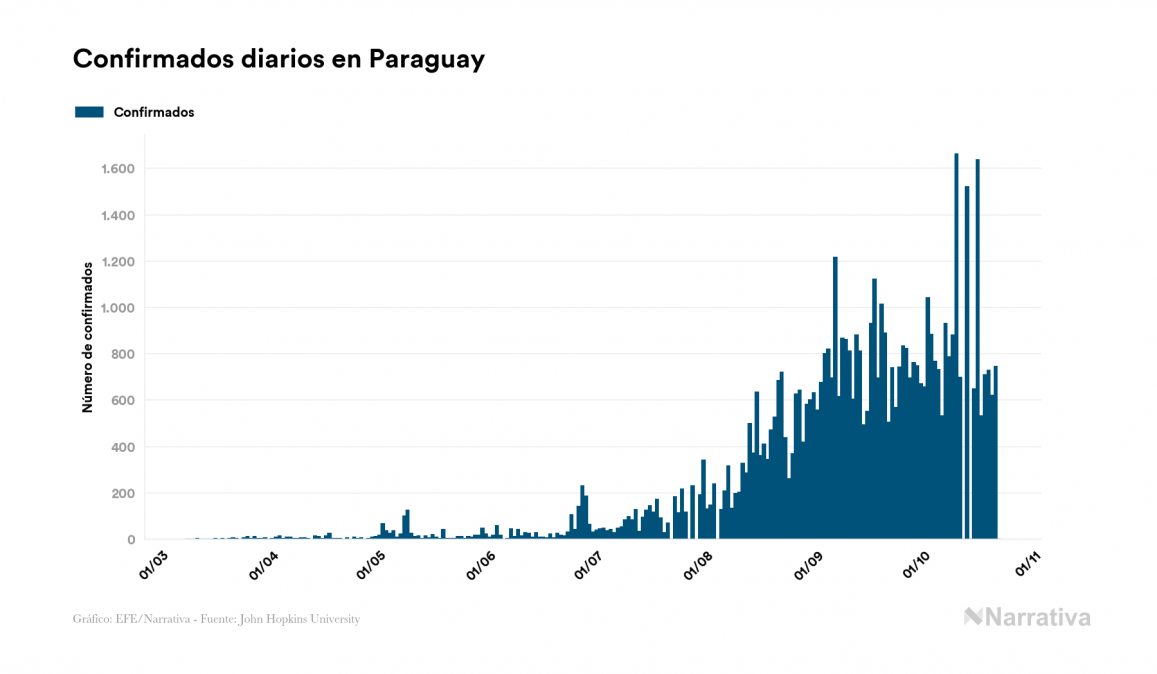 El coronavirus deja ya 56.819 casos de contagio en Paraguay, con 17.896 de ellos actualmente activos y 1.250 fallecidos, según los últimos datos correspondientes al 22 de octubre. Además, un total de 37.673 personas ya se ha recuperado desde que se produjo el primer contagio en el país.