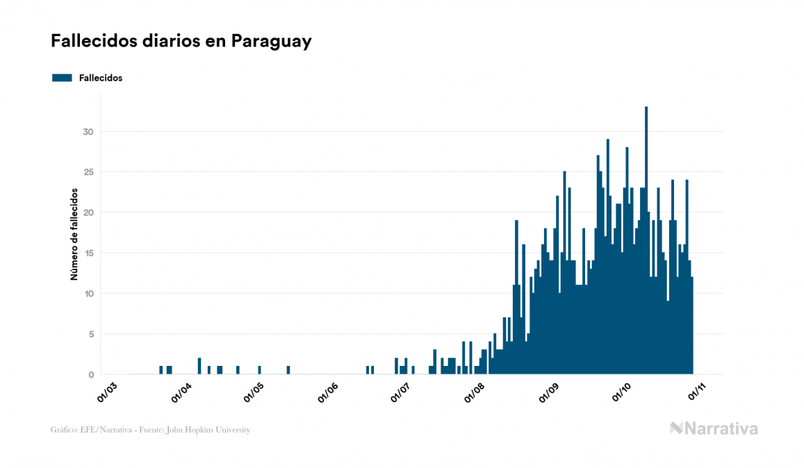 La COVID-19 deja ya 61.290 casos de contagio en Paraguay, con 18.643 de ellos actualmente activos y 1.359 fallecidos, según los últimos datos correspondientes al 29 de octubre. Además, un total de 41.288 personas ya se ha recuperado desde que se produjo el primer contagio en el país.