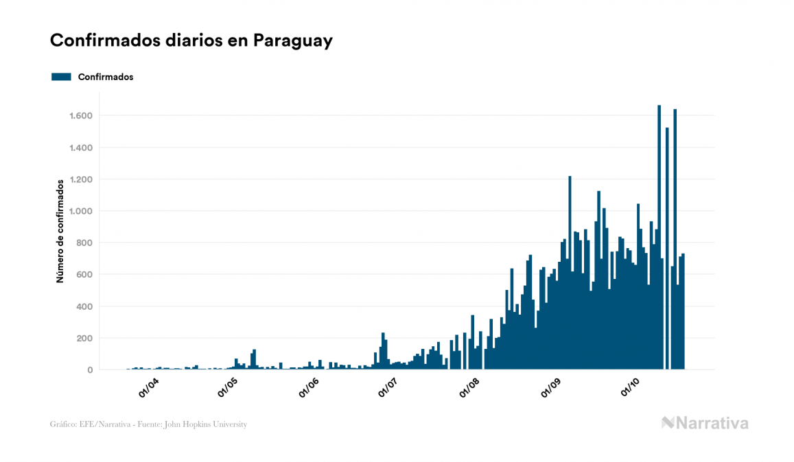 El coronavirus deja ya 55.452 casos de contagio en Paraguay, con 17.582 de ellos actualmente activos y 1.207 fallecidos, según los últimos datos correspondientes al 20 de octubre. Además, un total de 36.663 personas ya se ha recuperado desde que se produjo el primer contagio en el país.
