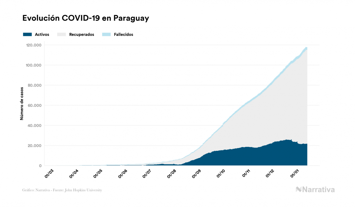 El nuevo coronavirus deja ya 117.590 casos de contagio en Paraguay, con 21.895 de ellos actualmente activos y 2.437 fallecidos, según los últimos datos correspondientes al 13 de enero. Además, un total de 93.258 personas ya se ha recuperado desde que se produjo el primer contagio en el país.