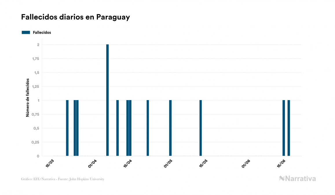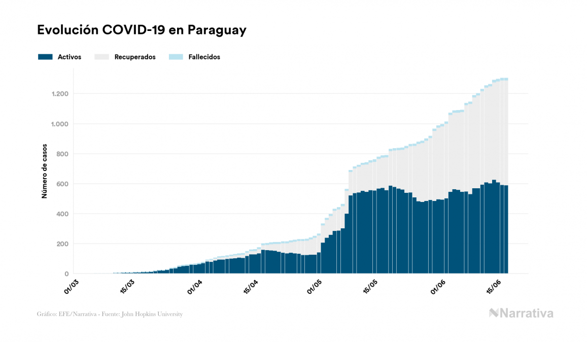 El coronavirus deja ya 1.303 casos de contagio en Paraguay, con 591 de ellos actualmente activos y 13 fallecidos, según los últimos datos correspondientes al 17 de junio. Además, un total de 699 personas ya se ha recuperado desde que se produjo el primer contagio en el país.