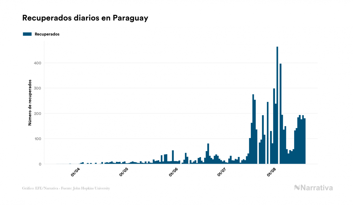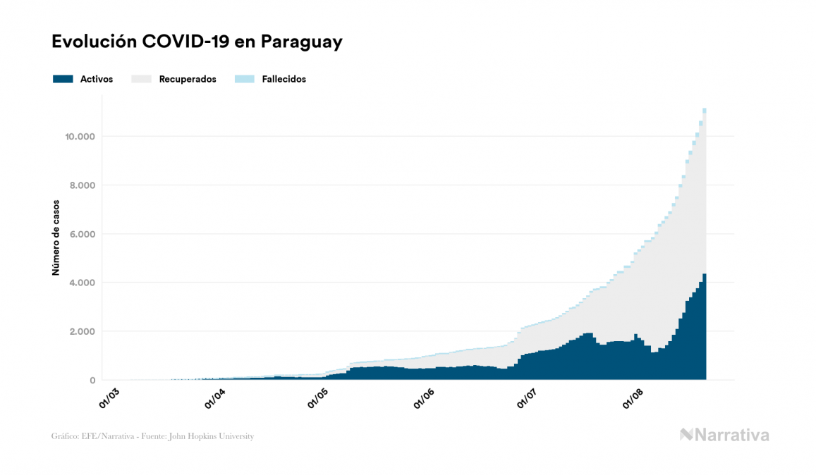 Según los últimos datos, actualmente en Paraguay hay 4.386 casos activos de COVID-19 tras confirmarse 527 nuevos positivos y 180 altas médicas este jueves. Desde el comienzo de la pandemia, la cifra total de contagiados asciende a 11.133, con 6.582 recuperados y 165 fallecidos.