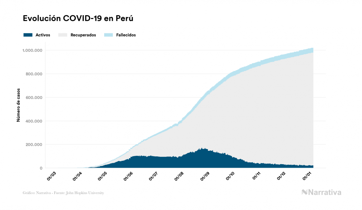 La COVID-19 deja ya 1.019.475 casos de contagio en Perú, con 22.963 de ellos actualmente activos y 37.830 fallecidos, según los últimos datos correspondientes al 5 de enero. Además, un total de 958.682 personas ya se ha recuperado desde que se produjo el primer contagio en el país.