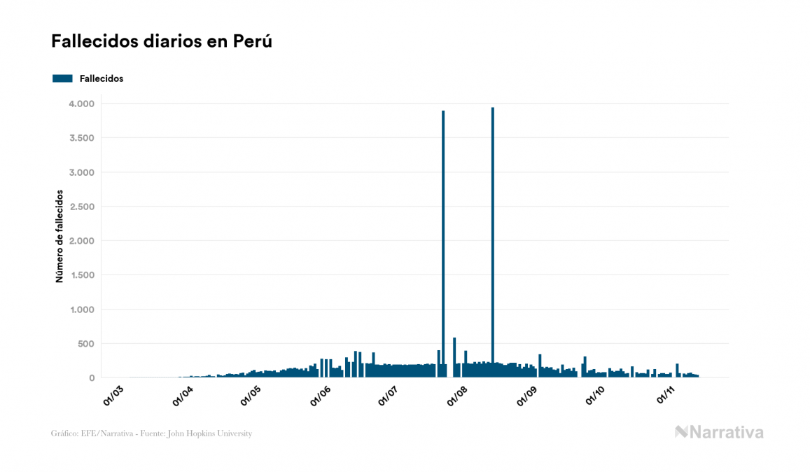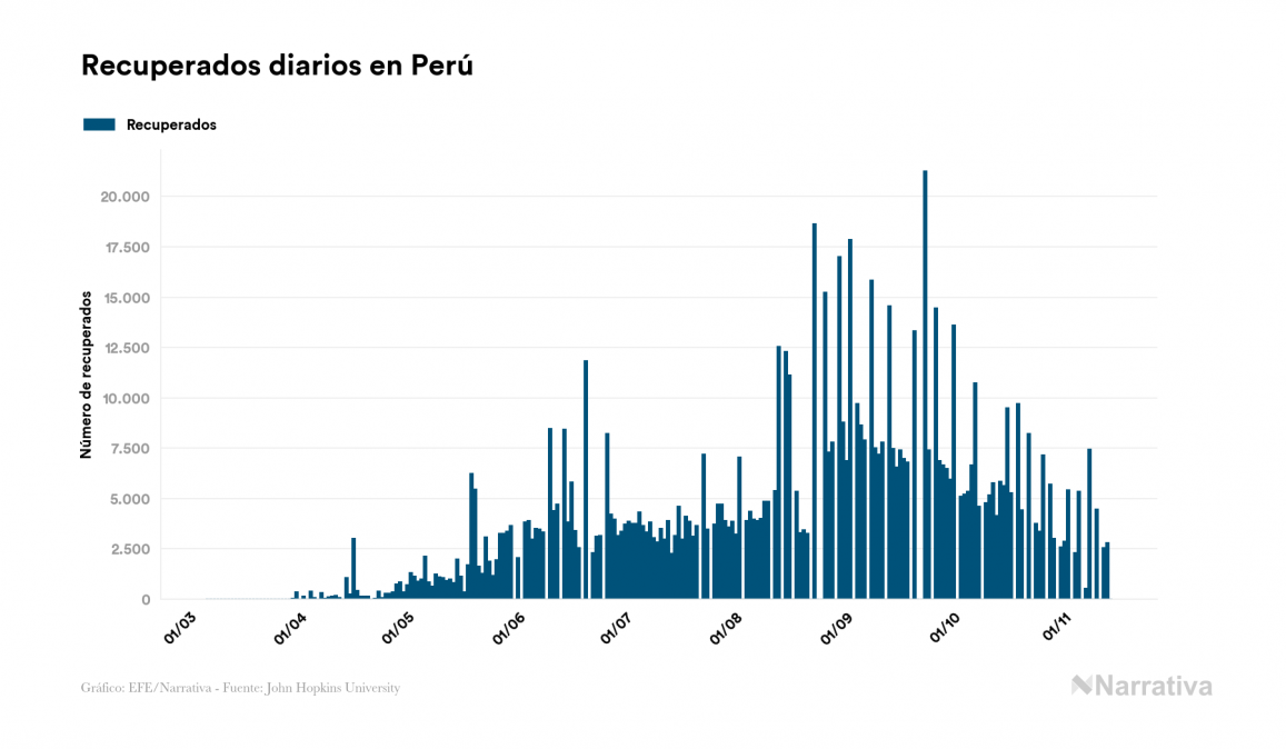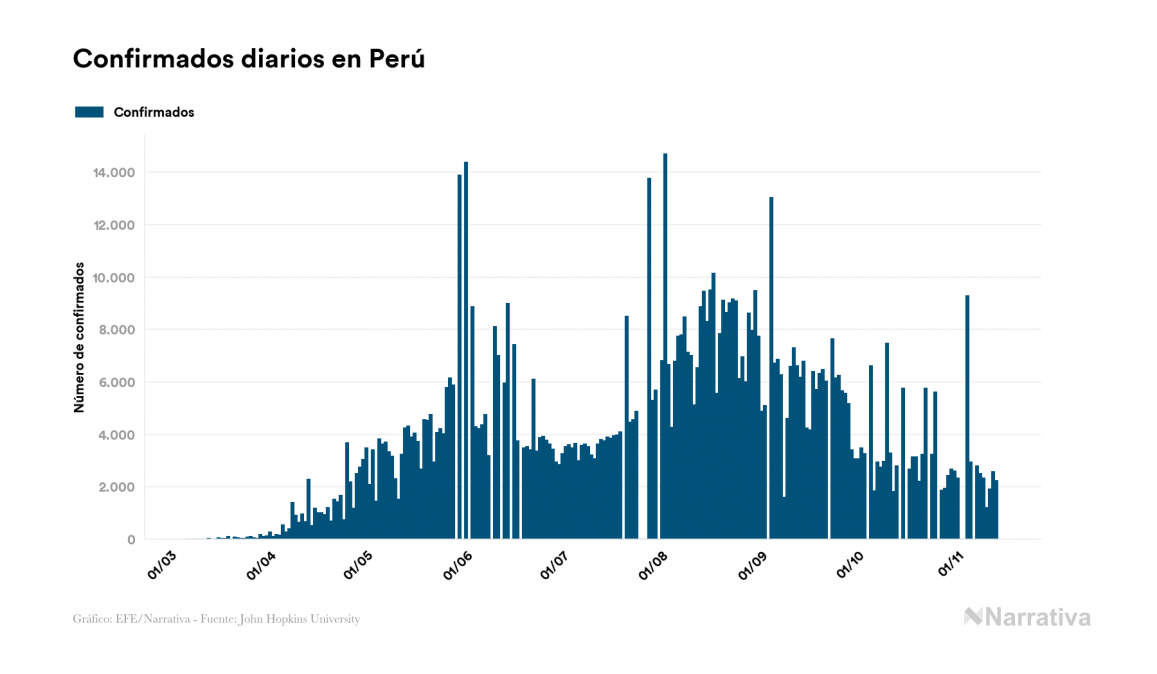 La COVID-19 deja ya 930.237 casos de contagio en Perú, con 39.147 de ellos actualmente activos y 35.067 fallecidos, según los últimos datos correspondientes al 14 de noviembre. Además, un total de 856.023 personas ya se ha recuperado desde que se produjo el primer contagio en el país.