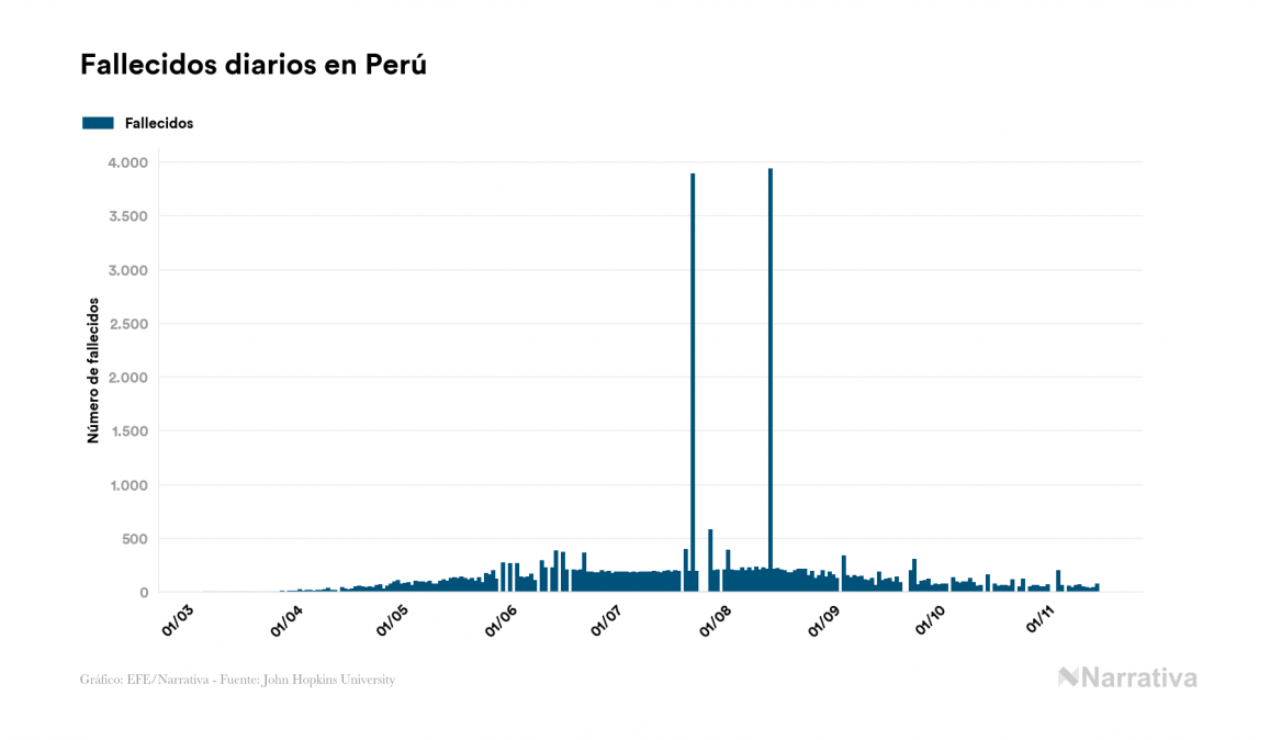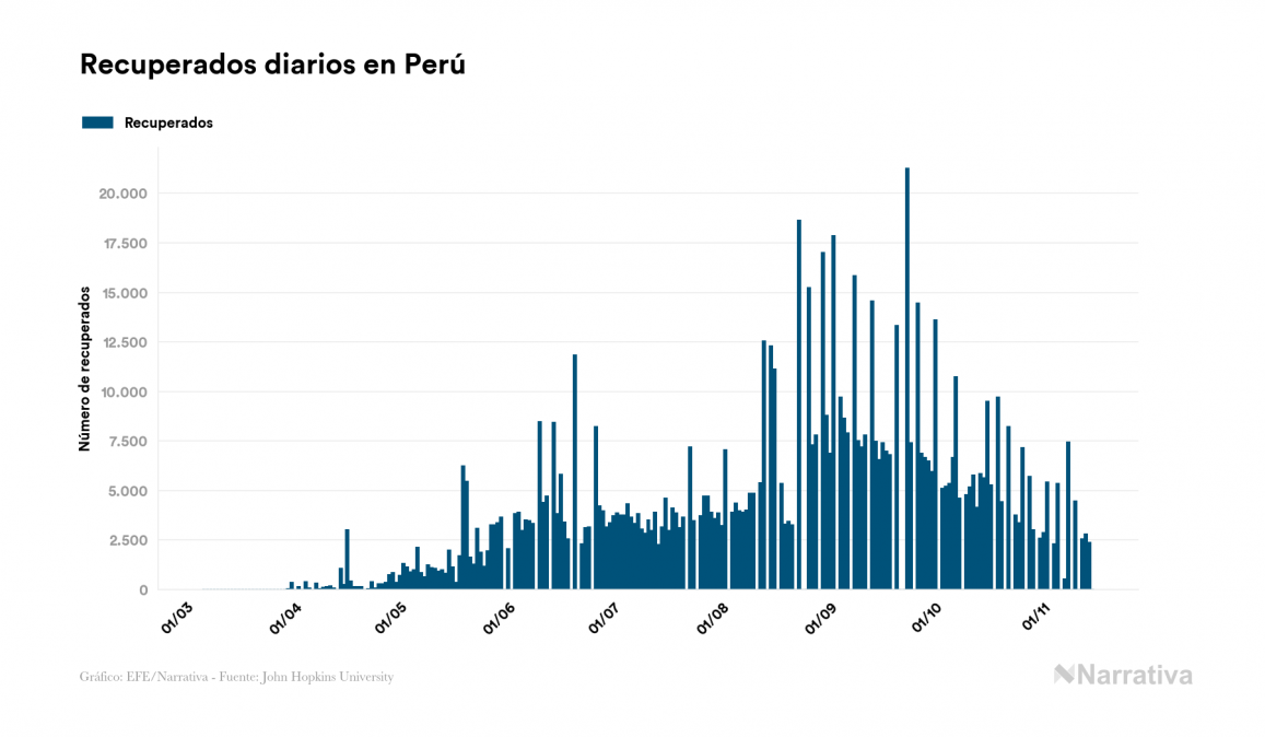 La COVID-19 deja ya 934.899 casos de contagio en Perú, con 41.334 de ellos actualmente activos, 35.177 fallecidos y 2.249 nuevos positivos, según los últimos datos correspondientes al 15 de noviembre. Además, desde el primer positivo se han recuperado 858.388 personas.