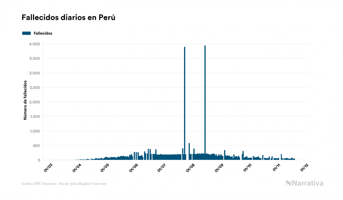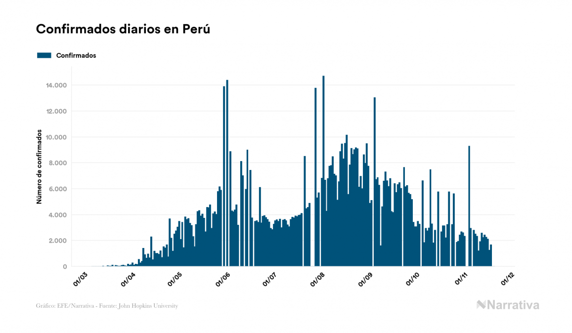 El coronavirus deja ya 939.931 casos de contagio en Perú, con 33.080 de ellos actualmente activos y 35.317 fallecidos, según los últimos datos correspondientes al 20 de noviembre. Además, un total de 871.534 personas ya se ha recuperado desde que se produjo el primer contagio en el país.