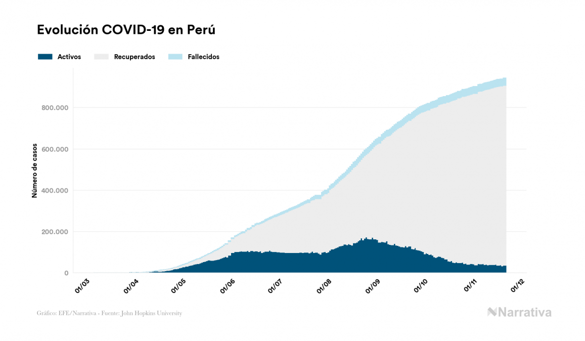 El coronavirus deja ya 943.917 casos de contagio en Perú, con 36.937 de ellos actualmente activos y 35.446 fallecidos, según los últimos datos correspondientes al 21 de noviembre. Además, un total de 871.534 personas ya se ha recuperado desde que se produjo el primer contagio en el país.