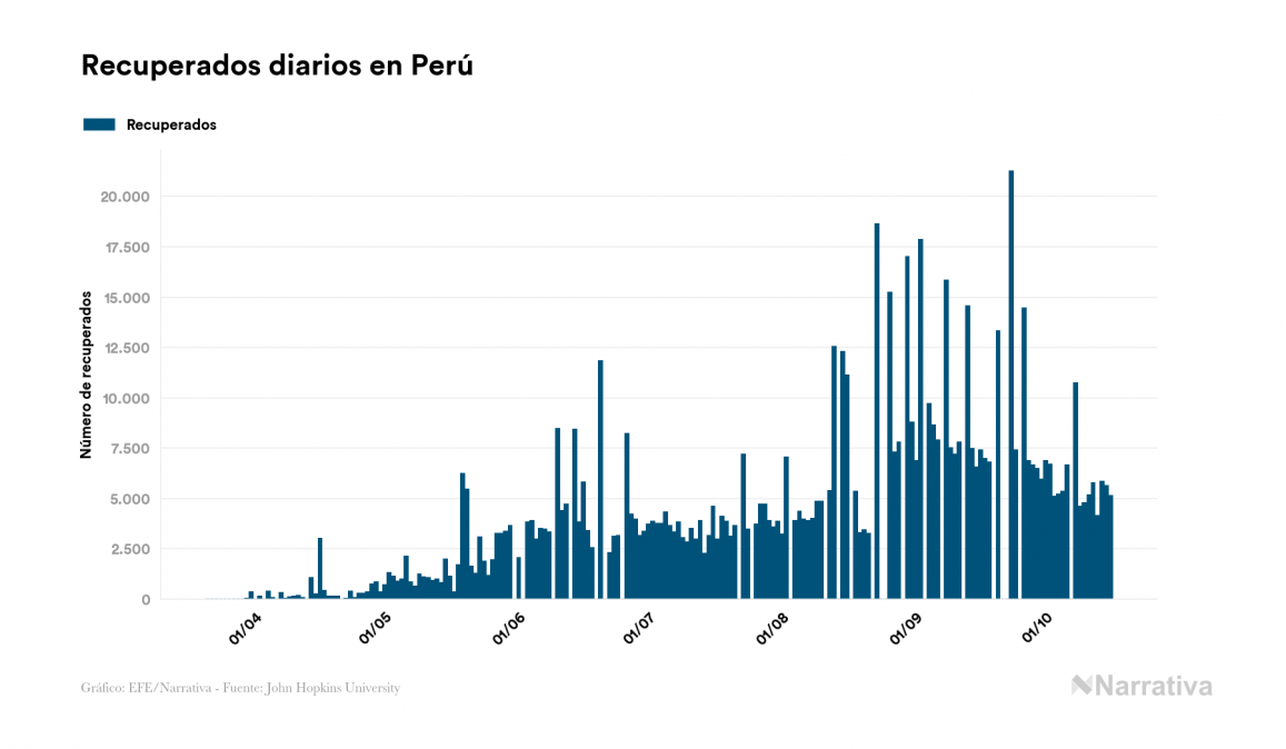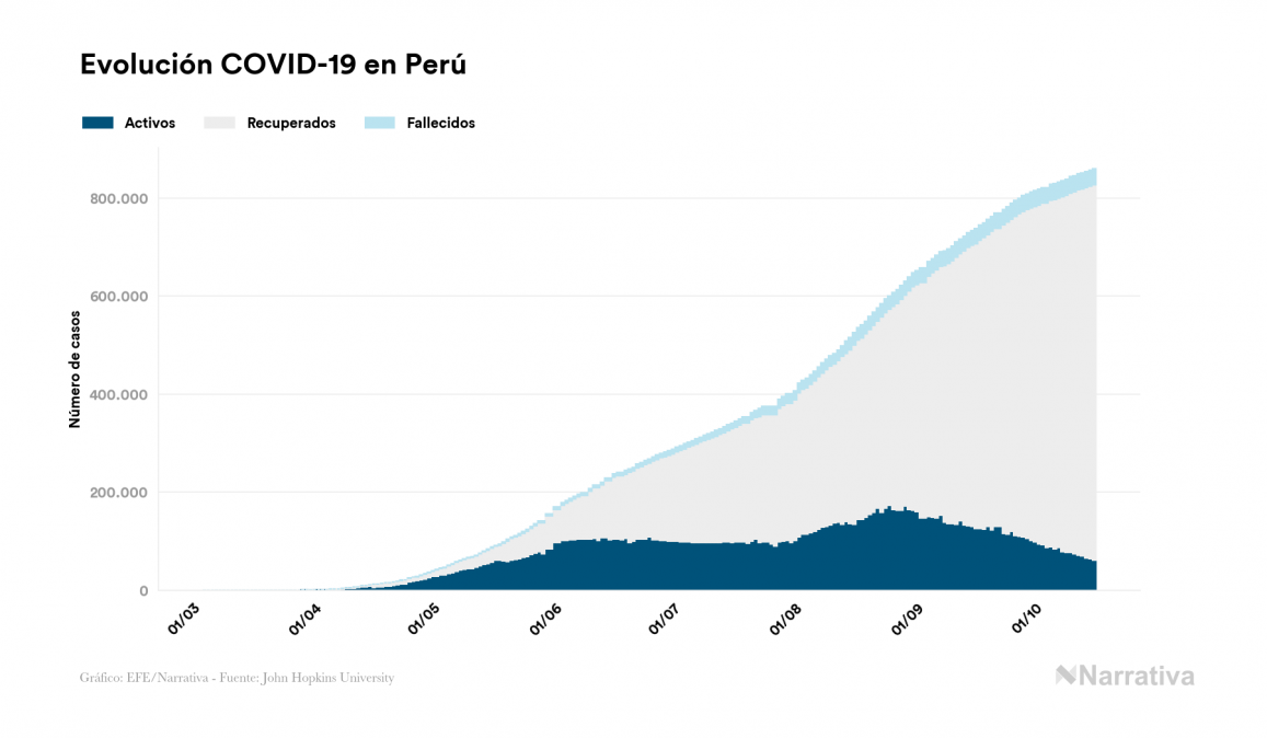Según los últimos datos, actualmente en Perú hay 61.413 casos activos de COVID-19 tras confirmarse 2.789 nuevos positivos y 5.153 altas médicas este viernes. Desde el comienzo de la pandemia, el número total de contagiados asciende a 859.740, con 764.750 recuperados y 33.577 fallecidos.