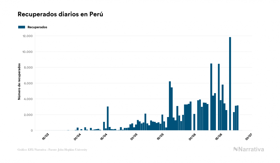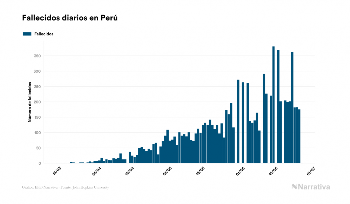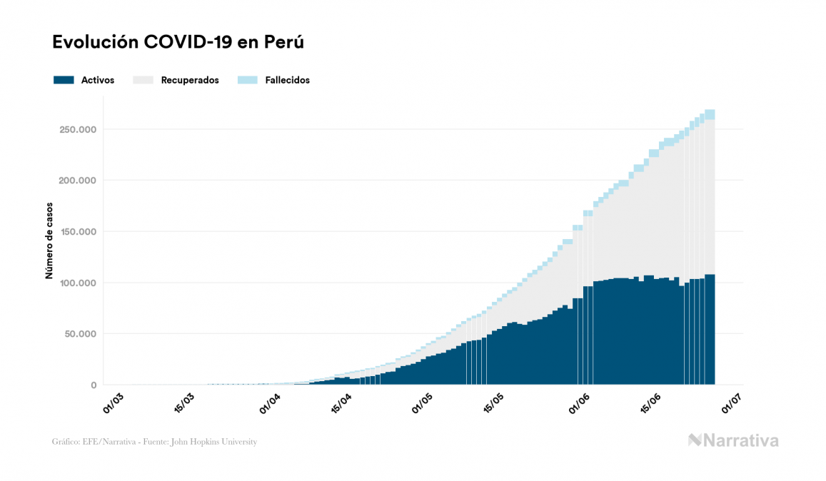 La COVID-19 deja ya 268.602 casos de contagio en Perú, con 108.616 de ellos actualmente activos y 8.761 fallecidos, según los últimos datos correspondientes al 26 de junio. Además, un total de 151.225 personas ya se ha recuperado desde que se produjo el primer contagio en el país.