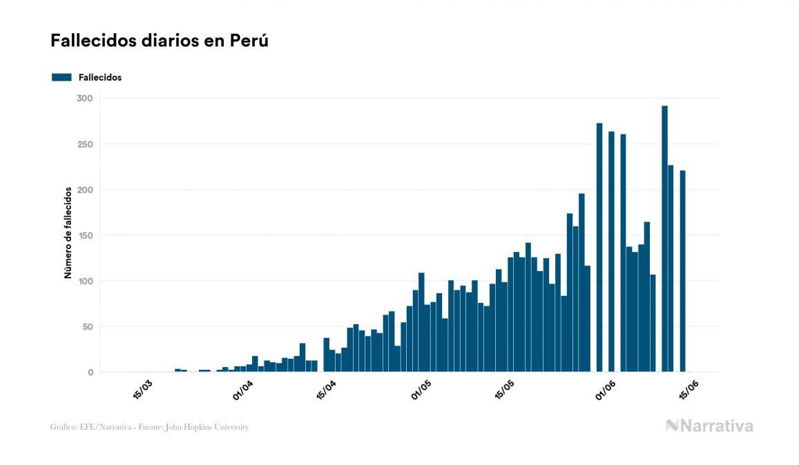 La COVID-19 deja ya 220.749 casos de contagio en Perú, con 102.717 de ellos actualmente activos y 6.308 fallecidos, según los últimos datos correspondientes al 14 de junio. Además, un total de 111.724 personas ya se ha recuperado, tras sumarse 4.591 en el último informe.