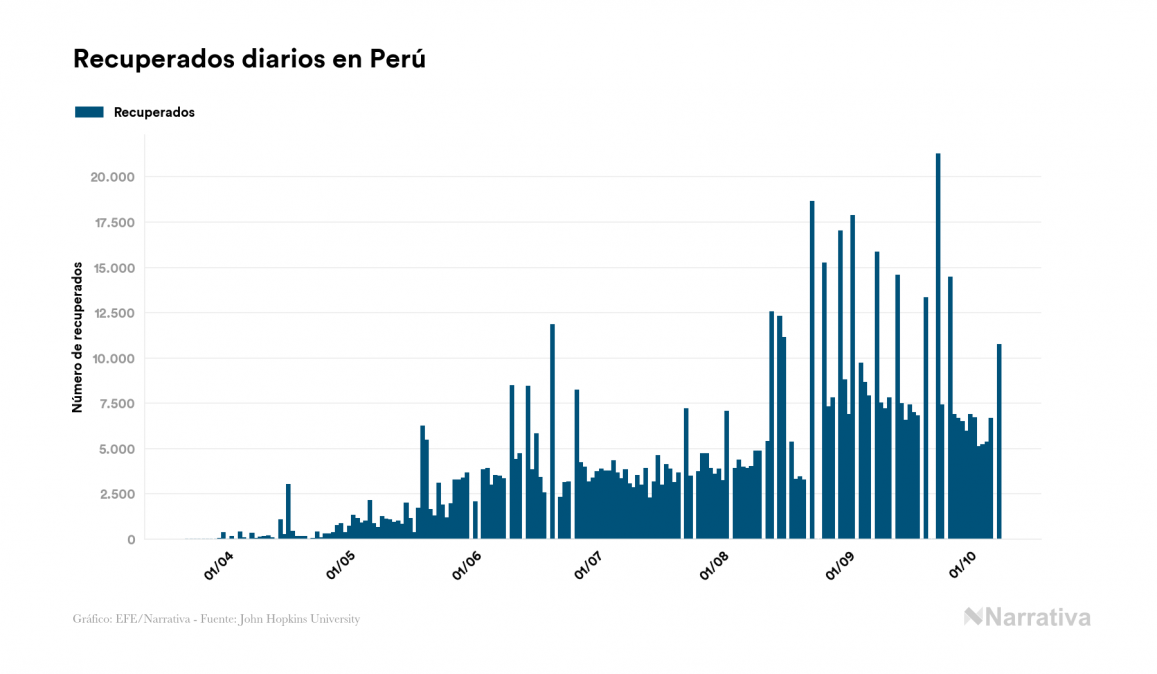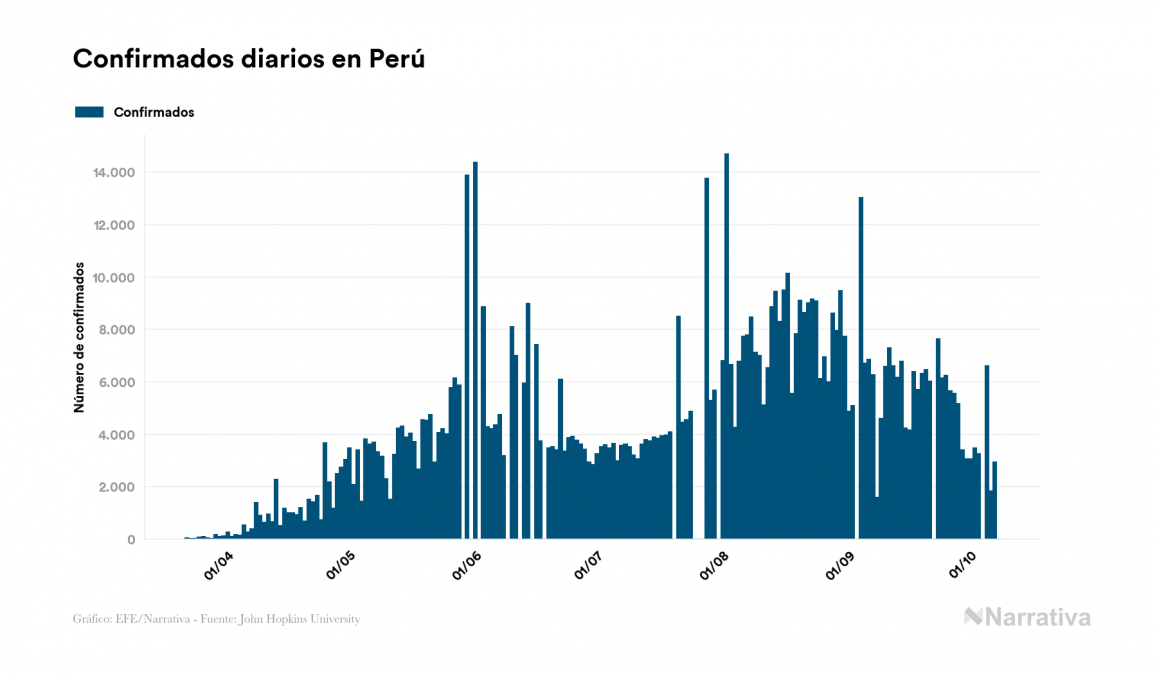 El nuevo coronavirus deja ya 832.929 casos de contagio en Perú, con 76.409 de ellos actualmente activos y 32.914 fallecidos, según los últimos datos correspondientes al 8 de octubre. Además, un total de 723.606 personas ya se ha recuperado, tras sumarse 10.718 en el último informe.