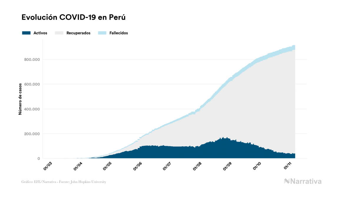 El coronavirus deja ya 914.722 casos de contagio en Perú, con 41.727 de ellos actualmente activos y 34.730 fallecidos, según los últimos datos correspondientes al 6 de noviembre. Además, un total de 838.265 personas ya se ha recuperado desde que se produjo el primer contagio en el país.