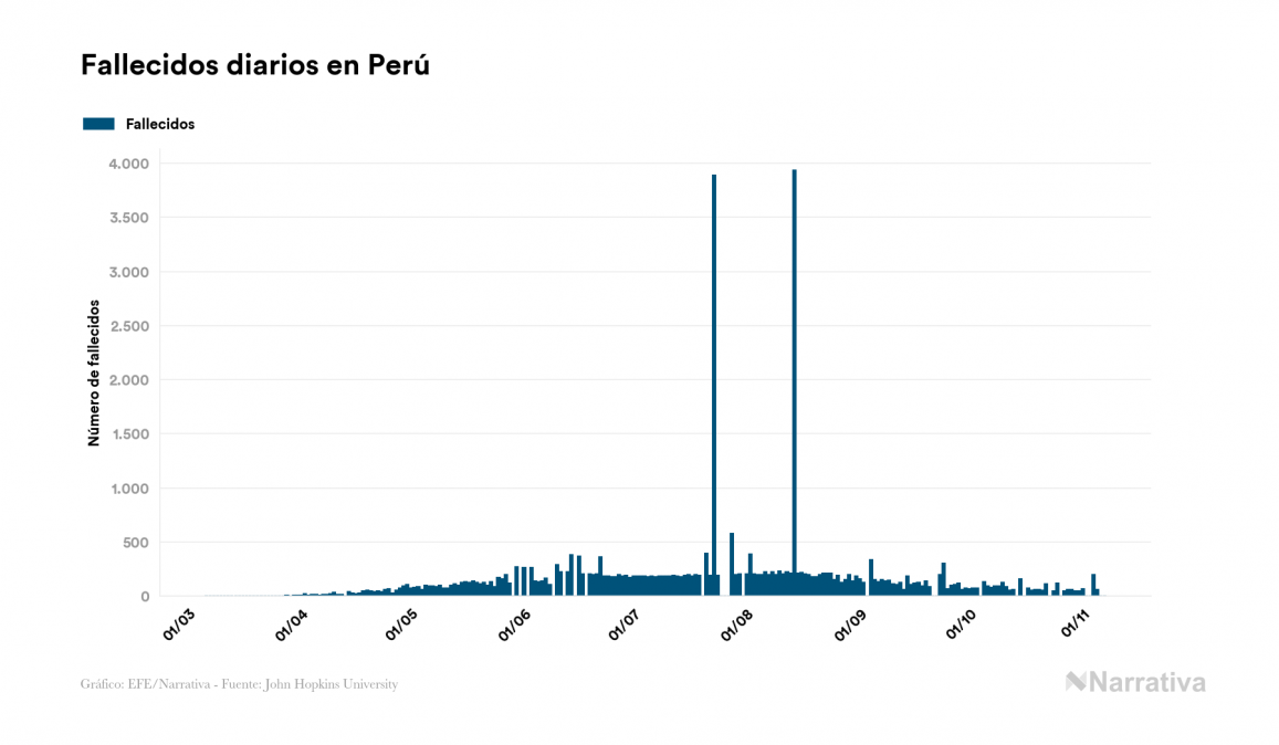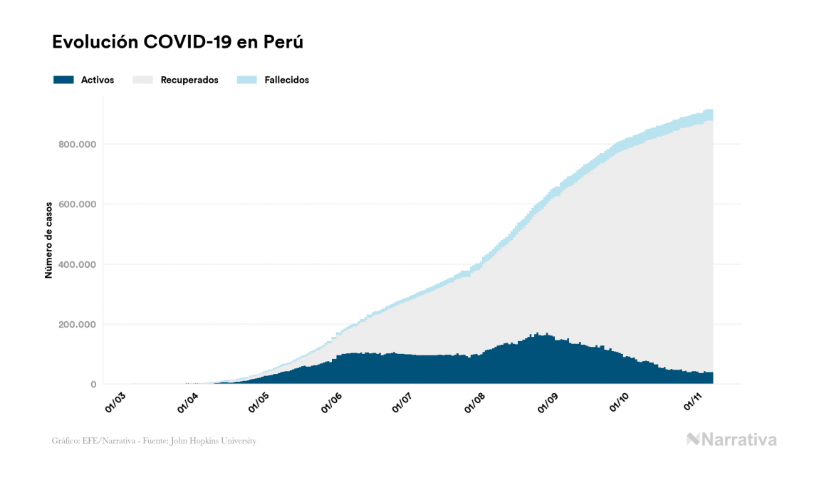 El coronavirus deja ya 914.722 casos de contagio en Perú, con 41.209 de ellos actualmente activos y 34.730 fallecidos, según los últimos datos correspondientes al 7 de noviembre. Además, un total de 838.783 personas ya se ha recuperado, tras sumarse 518 en el último informe.