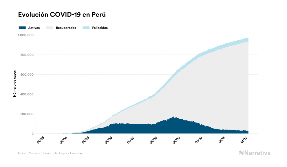 El nuevo coronavirus deja ya 967.075 casos de contagio en Perú, con 29.455 de ellos actualmente activos y 36.076 fallecidos, según los últimos datos correspondientes al 4 de diciembre. Además, un total de 901.544 personas ya se ha recuperado, tras sumarse 2.331 en el último informe.