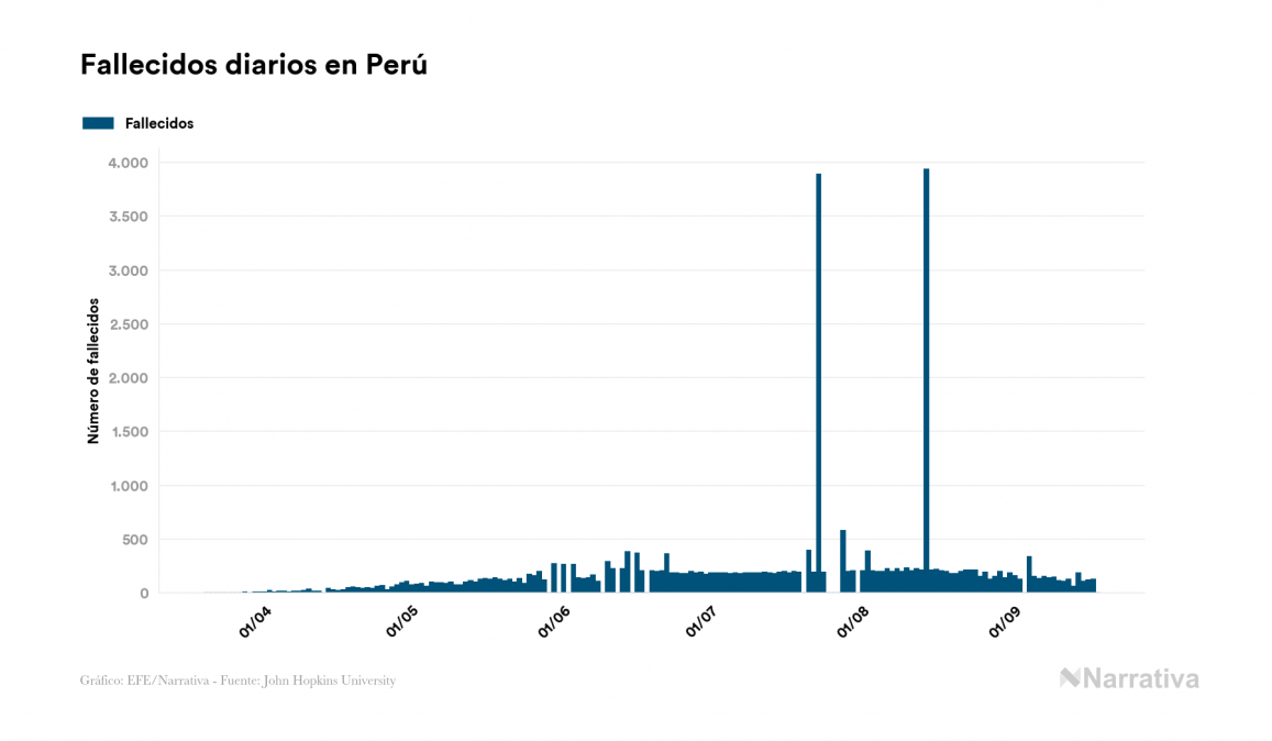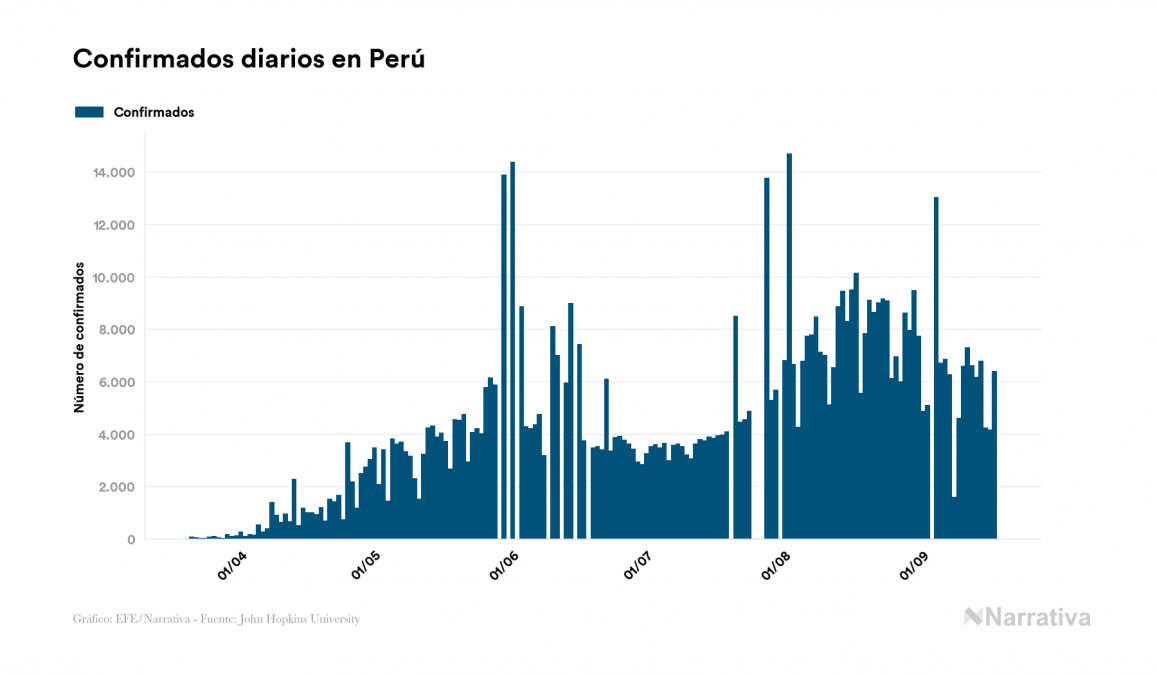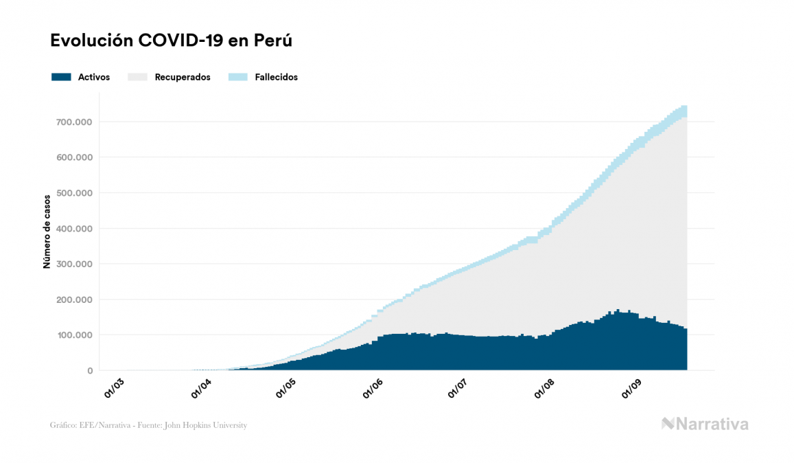 El nuevo coronavirus deja ya 744.400 casos de contagio en Perú, con 118.836 de ellos actualmente activos y 31.051 fallecidos, según los últimos datos correspondientes al 18 de septiembre. Además, un total de 594.513 personas ya se ha recuperado, tras sumarse 6.796 en el último informe.