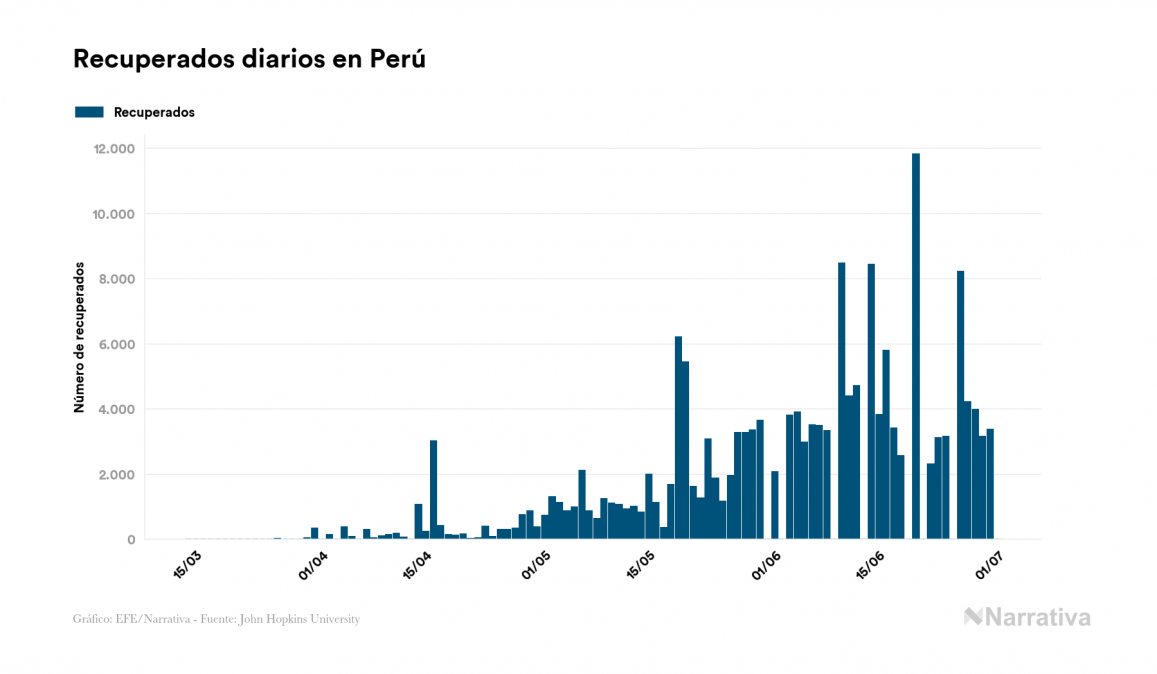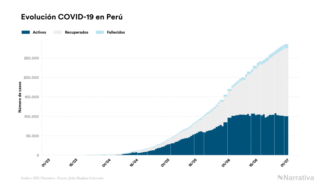 La COVID-19 deja ya 285.213 casos de contagio en Perú, con 101.001 de ellos actualmente activos y 9.677 fallecidos, según los últimos datos correspondientes al 1 de julio. Además, un total de 174.535 personas ya se ha recuperado desde que se produjo el primer contagio en el país.