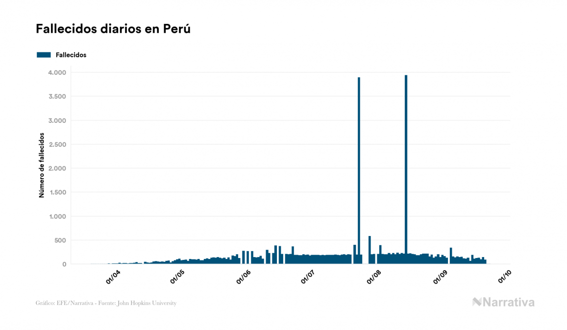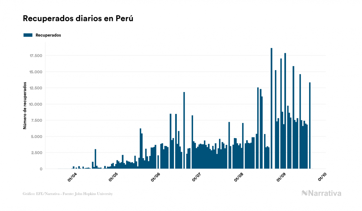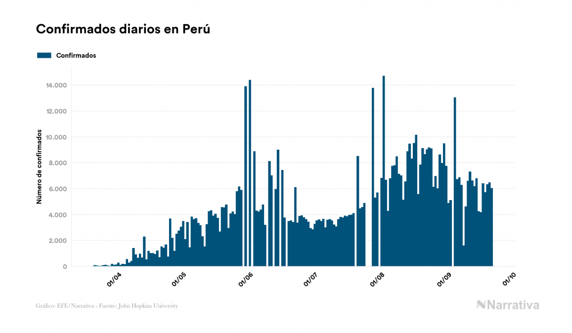 El coronavirus deja ya 768.895 casos de contagio en Perú, con 129.689 de ellos actualmente activos y 31.369 fallecidos, según los últimos datos correspondientes al 22 de septiembre. Además, un total de 607.837 personas ya se ha recuperado desde que se produjo el primer contagio en el país.