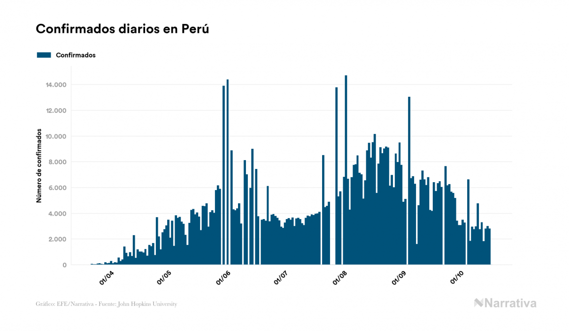 La COVID-19 deja ya 859.740 casos de contagio en Perú, con 57.086 de ellos actualmente activos y 33.577 fallecidos, según los últimos datos correspondientes al 17 de octubre. Además, un total de 769.077 personas ya se ha recuperado, tras sumarse 4.327 en el último informe.