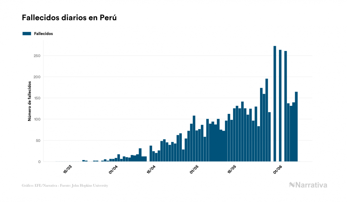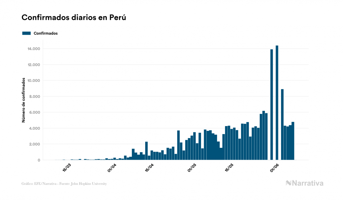 La COVID-19 deja ya 196.515 casos de contagio en Perú, con 104.831 de ellos actualmente activos y 5.465 fallecidos, según los últimos datos correspondientes al 8 de junio. Además, un total de 86.219 personas ya se ha recuperado desde que se produjo el primer contagio en el país.