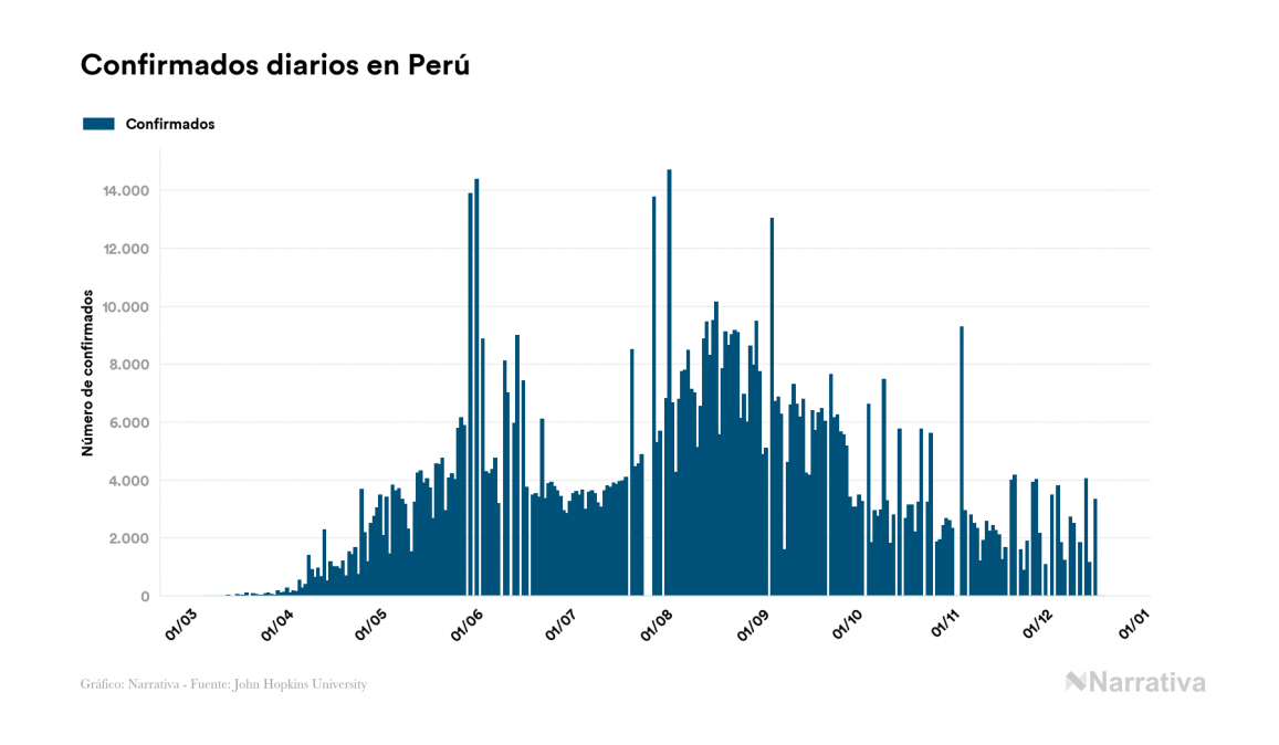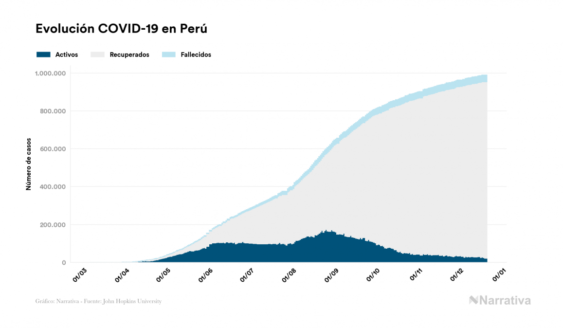 El coronavirus deja ya 989.457 casos de contagio en Perú, con 22.189 de ellos actualmente activos y 36.858 fallecidos, según los últimos datos correspondientes al 20 de diciembre. Además, un total de 930.410 personas ya se ha recuperado desde que se produjo el primer contagio en el país.