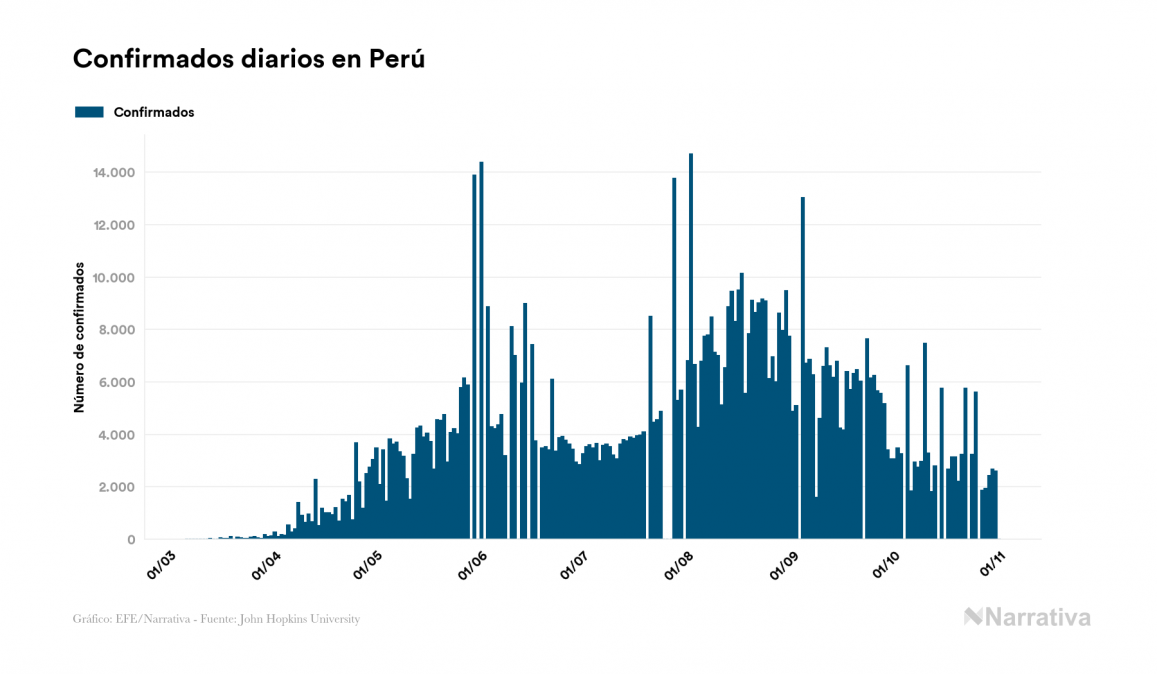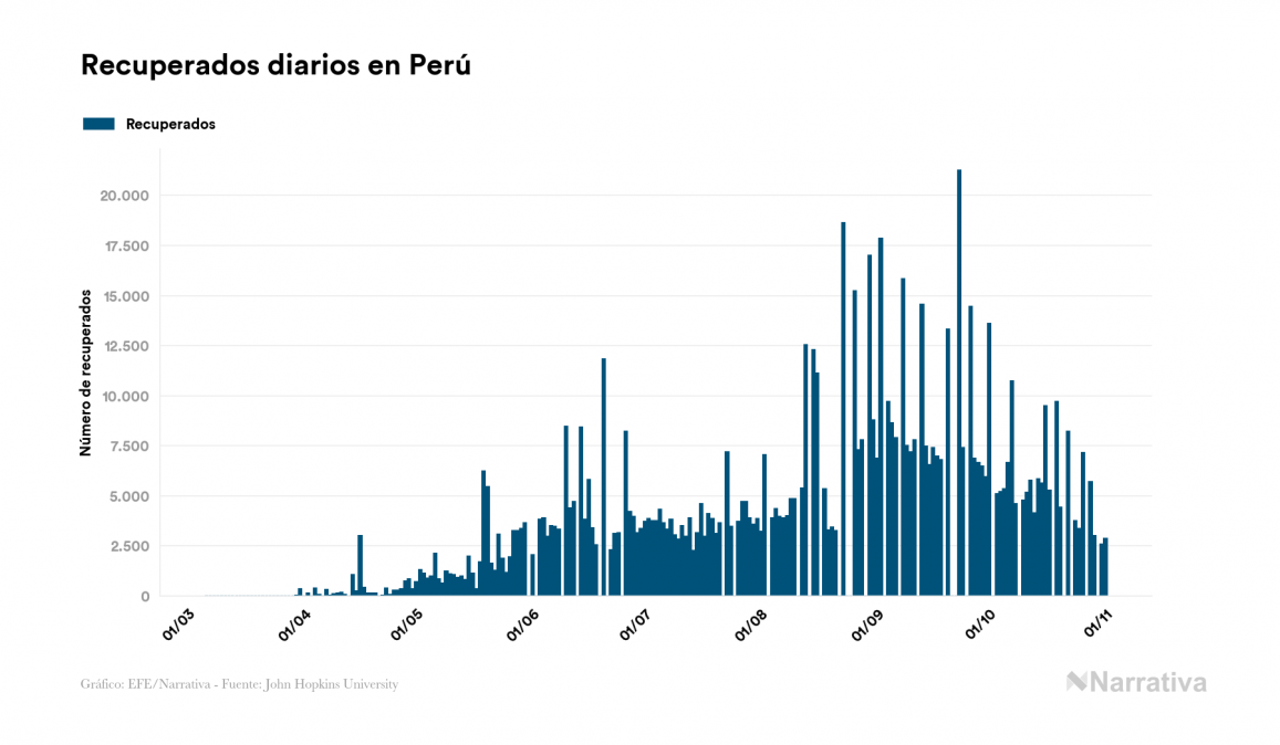 El nuevo coronavirus deja ya 900.180 casos de contagio en Perú, con 40.572 de ellos actualmente activos y 34.411 fallecidos, según los últimos datos correspondientes al 1 de noviembre. Además, un total de 825.197 personas ya se ha recuperado, tras sumarse 2.881 en el último informe.
