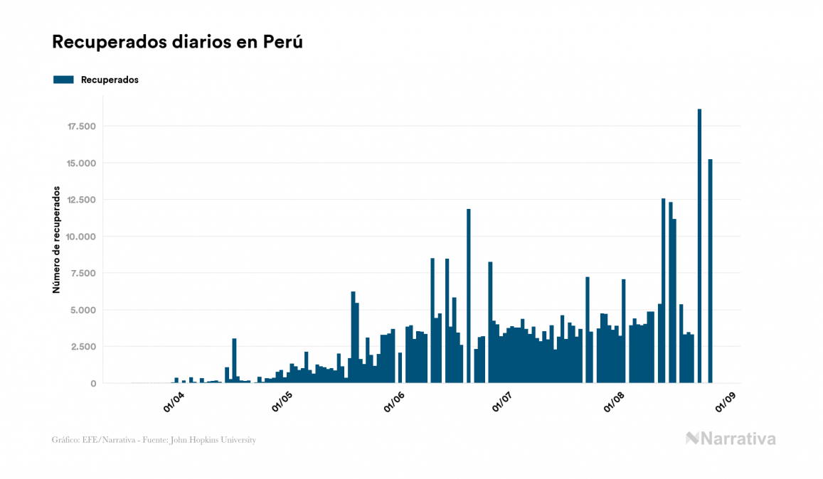La COVID-19 deja ya 600.438 casos de contagio en Perú, con 158.048 de ellos actualmente activos y 27.813 fallecidos, según los últimos datos correspondientes al 26 de agosto. Además, un total de 414.577 personas ya se ha recuperado, tras sumarse 15.220 en el último informe.