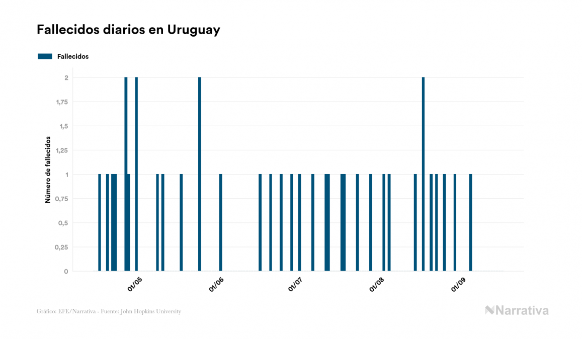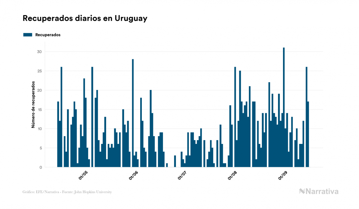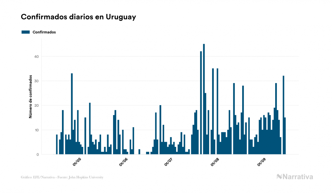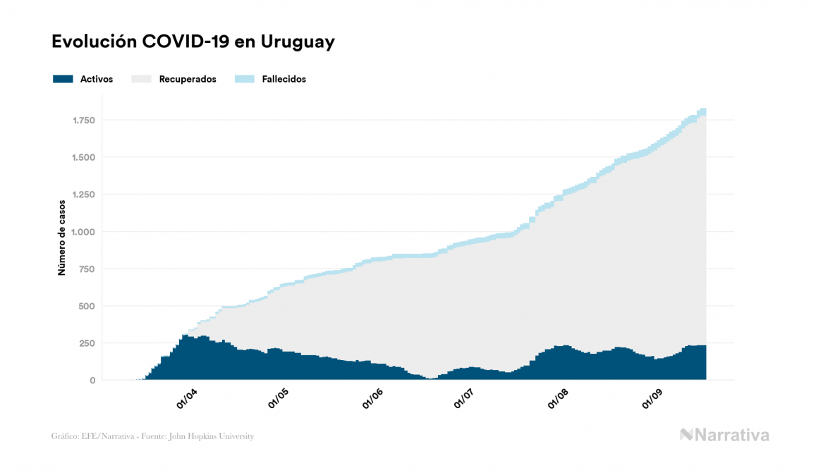 La COVID-19 deja ya 1.827 casos de contagio en Uruguay, con 237 de ellos actualmente activos y 45 fallecidos, según los últimos datos correspondientes al 16 de septiembre. Además, un total de 1.545 personas ya se ha recuperado desde que se produjo el primer contagio en el país.
