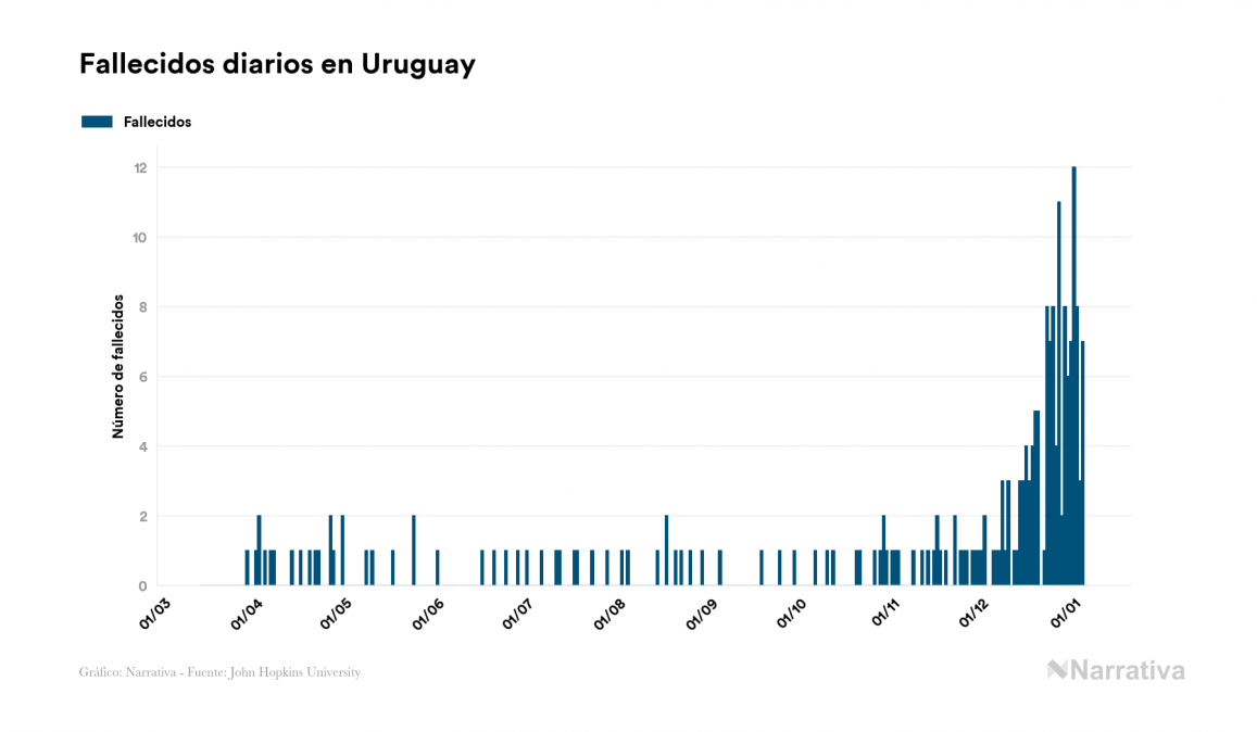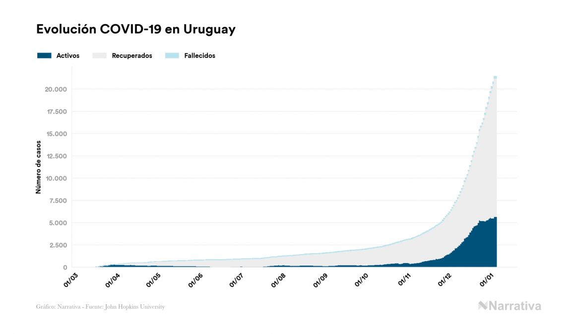 El coronavirus deja ya 21.426 casos de contagio en Uruguay, con 5.676 de ellos actualmente activos y 211 fallecidos, según los últimos datos correspondientes al 5 de enero. Además, un total de 15.539 personas ya se ha recuperado desde que se produjo el primer contagio en el país.