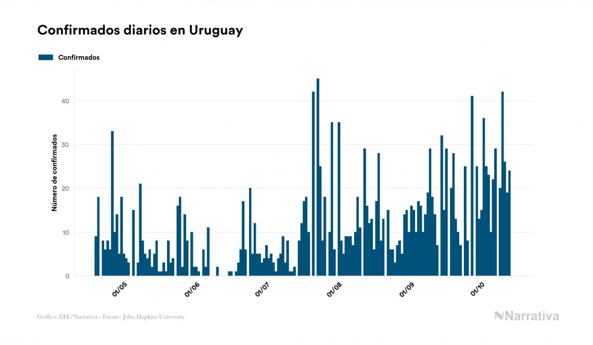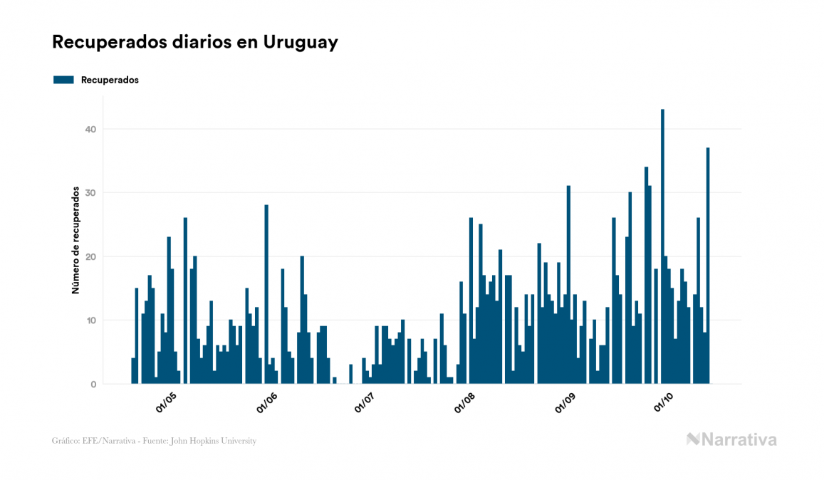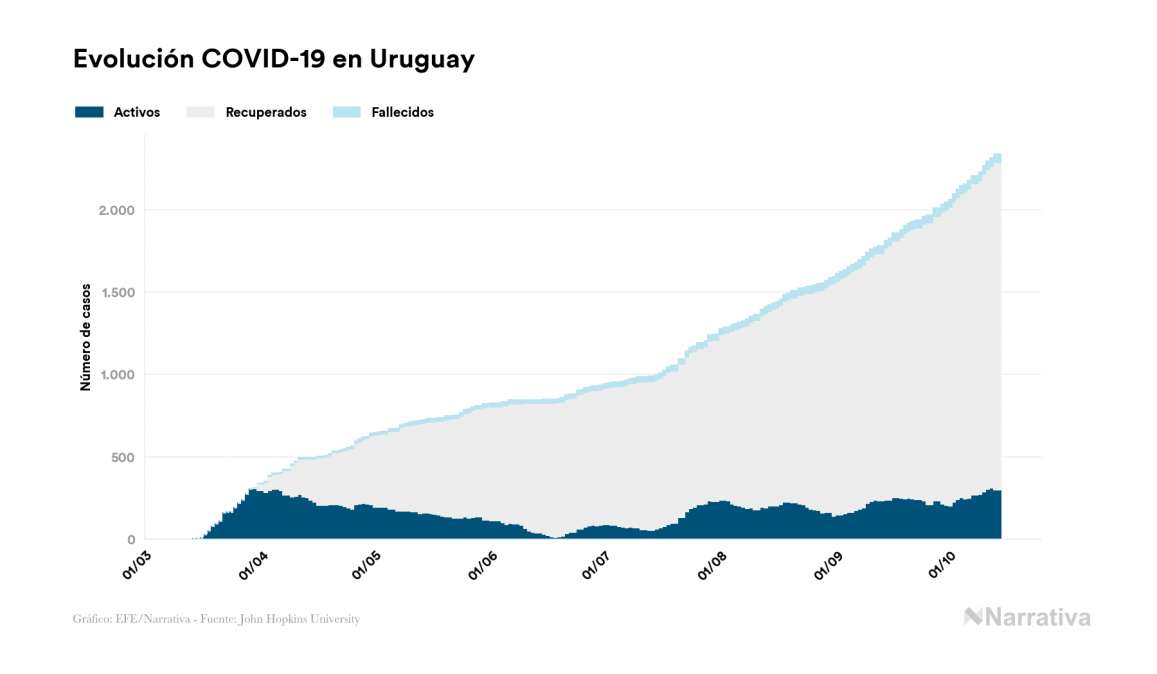 El nuevo coronavirus deja ya 2.337 casos de contagio en Uruguay, con 299 de ellos actualmente activos y 51 fallecidos, según los últimos datos correspondientes al 14 de octubre. Además, un total de 1.987 personas ya se ha recuperado desde que se produjo el primer contagio en el país.