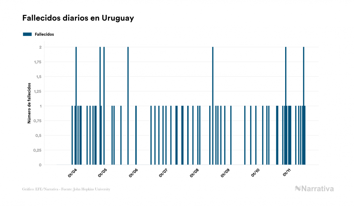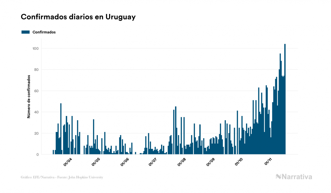 La COVID-19 deja ya 4.208 casos de contagio en Uruguay, con 792 de ellos actualmente activos y 68 fallecidos, según los últimos datos correspondientes al 18 de noviembre. Además, un total de 3.348 personas ya se ha recuperado desde que se produjo el primer contagio en el país.
