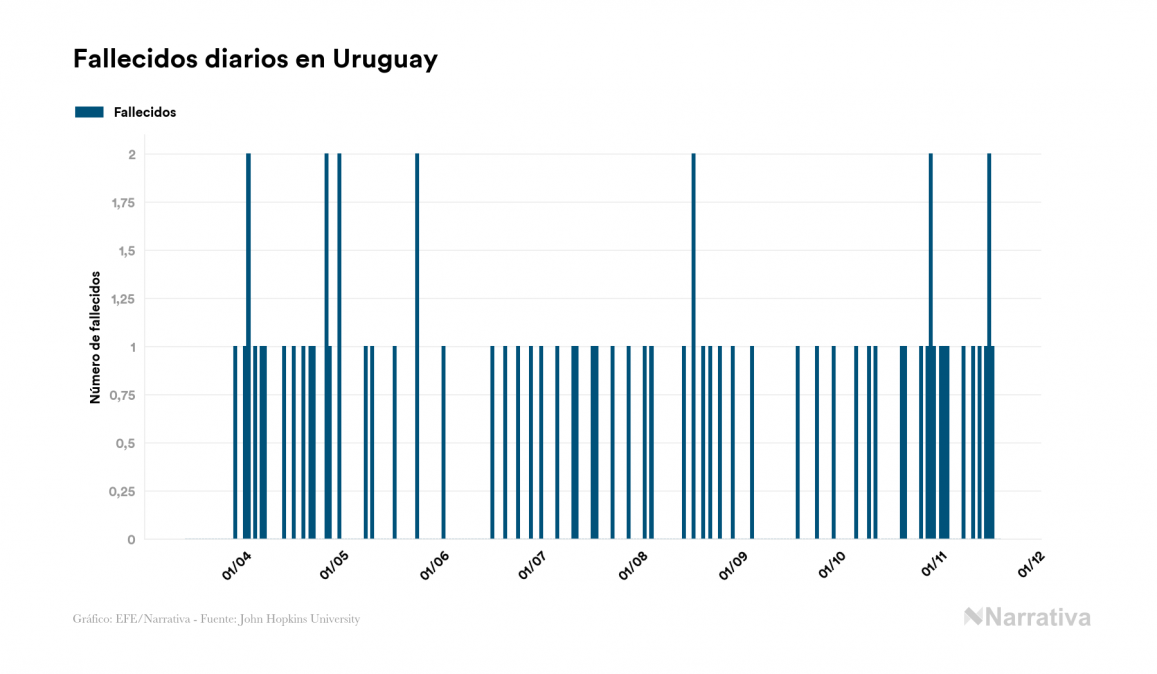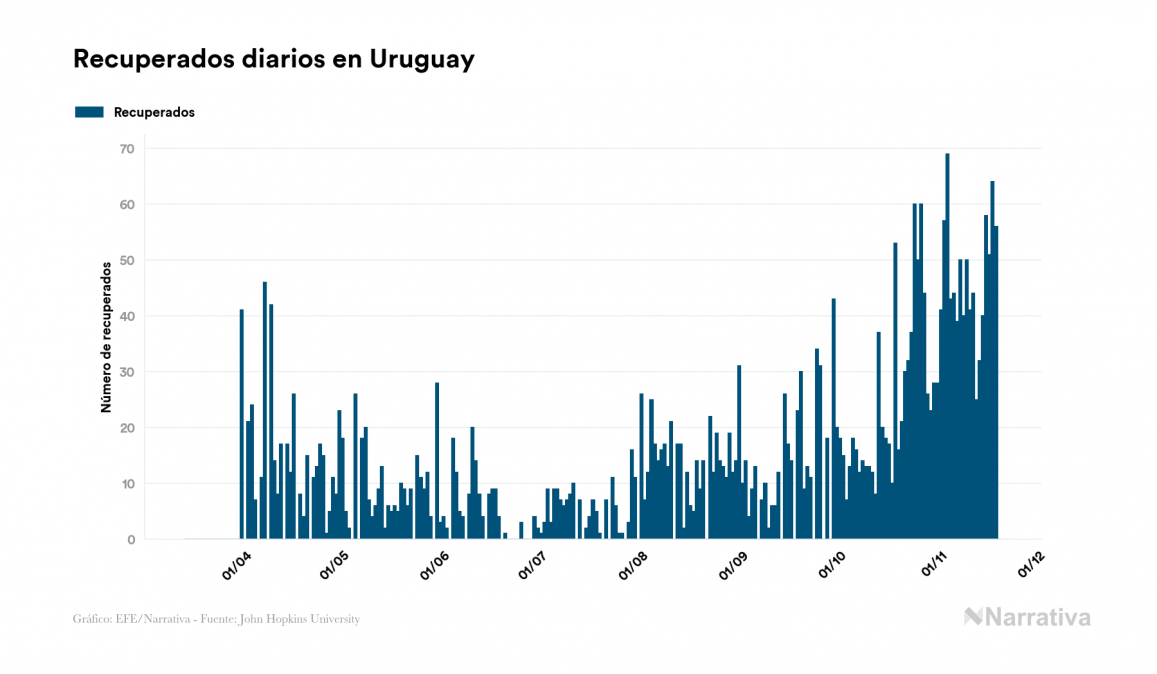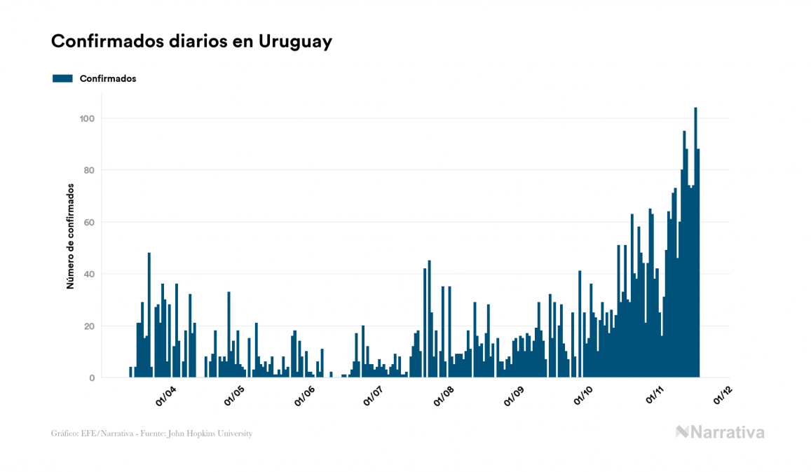 El coronavirus deja ya 4.296 casos de contagio en Uruguay, con 824 de ellos actualmente activos y 68 fallecidos, según los últimos datos correspondientes al 19 de noviembre. Además, un total de 3.404 personas ya se ha recuperado desde que se produjo el primer contagio en el país.