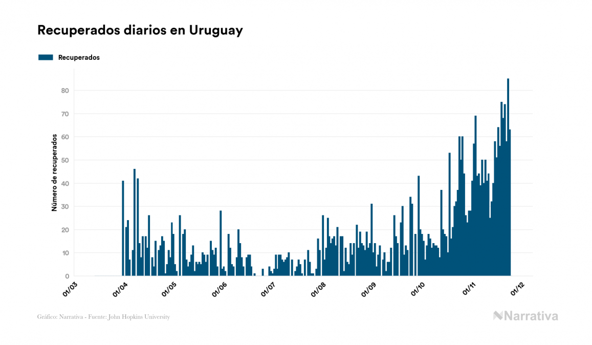 La COVID-19 deja ya 4.870 casos de contagio en Uruguay, con 971 de ellos actualmente activos y 72 fallecidos, según los últimos datos correspondientes al 25 de noviembre. Además, un total de 3.827 personas ya se ha recuperado desde que se produjo el primer contagio en el país.