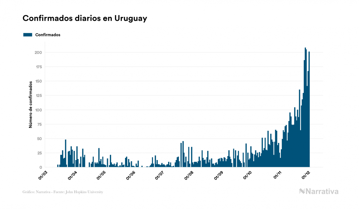 La COVID-19 deja ya 6.225 casos de contagio en Uruguay, con 1.561 de ellos actualmente activos y 80 fallecidos, según los últimos datos correspondientes al 3 de diciembre. Además, un total de 4.584 personas ya se ha recuperado desde que se produjo el primer contagio en el país.