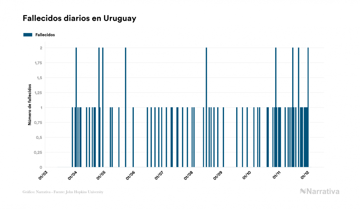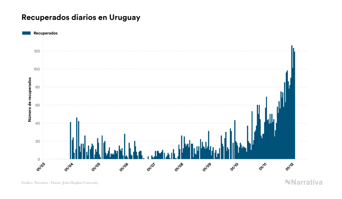 La COVID-19 deja ya 6.731 casos de contagio en Uruguay, con 1.825 de ellos actualmente activos y 80 fallecidos, según los últimos datos correspondientes al 5 de diciembre. Además, un total de 4.826 personas ya se ha recuperado desde que se produjo el primer contagio en el país.