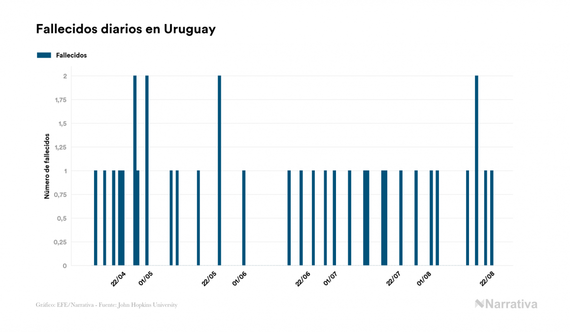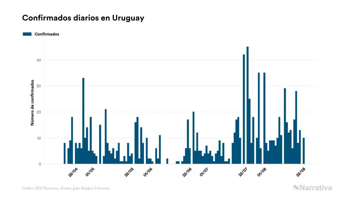 Según los últimos datos, actualmente en Uruguay hay 225 casos activos de COVID-19 tras confirmarse 10 nuevos positivos y siete altas médicas este sábado. Desde el comienzo de la pandemia, la cifra total de contagiados asciende a 1.516, con 1.249 recuperados y 42 fallecidos.