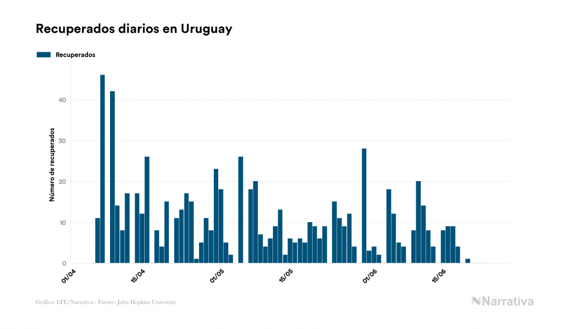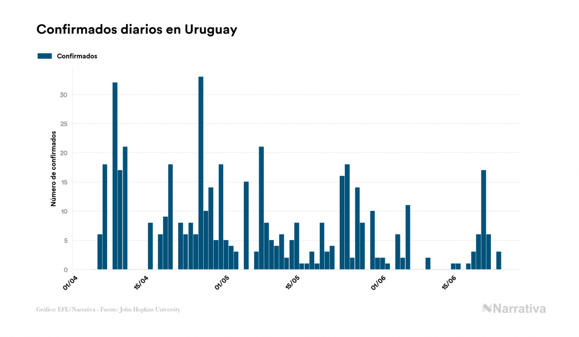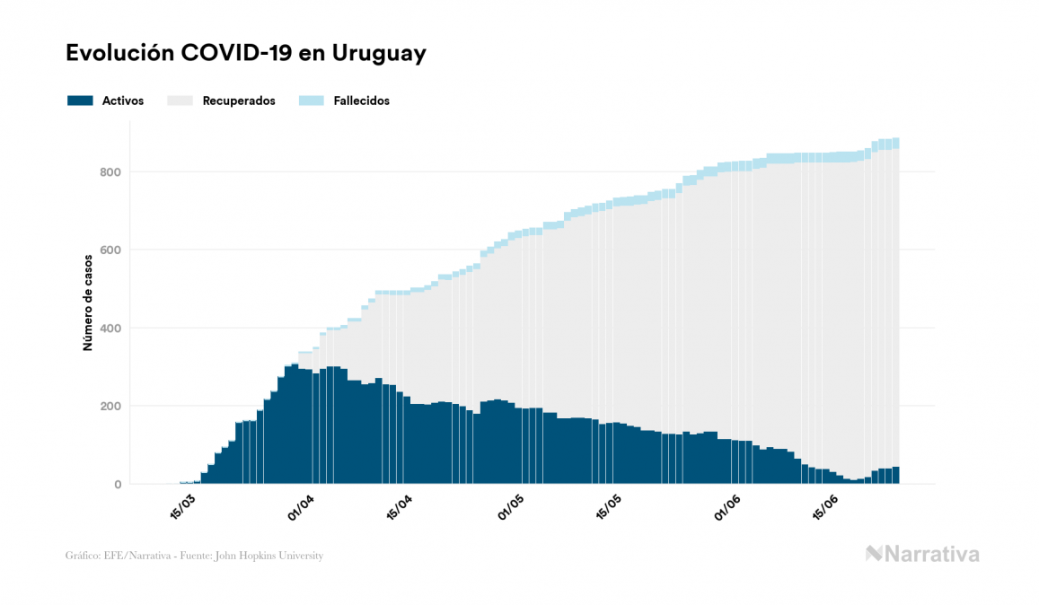 Según los últimos datos, actualmente en Uruguay hay 45 casos activos de COVID-19 tras confirmarse tres nuevos positivos este miércoles. Desde el comienzo de la pandemia, el número total de contagiados asciende a 885, con 815 recuperados y 25 fallecidos.
