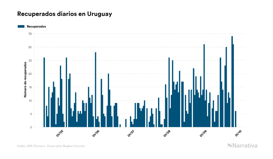 Según los últimos datos, actualmente en Uruguay hay 235 casos activos de coronavirus tras confirmarse 31 nuevos positivos y seis altas médicas este domingo. Desde el comienzo de la pandemia, el número total de contagiados asciende a 1.998, con 1.716 recuperados y 47 fallecidos.
