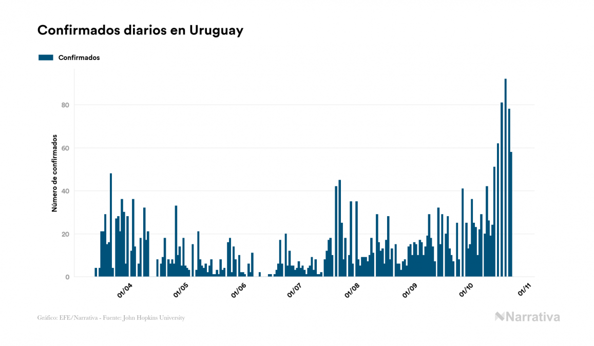 El coronavirus deja ya 2.759 casos de contagio en Uruguay, con 465 de ellos actualmente activos y 53 fallecidos, según los últimos datos correspondientes al 24 de octubre. Además, un total de 2.241 personas ya se ha recuperado desde que se produjo el primer contagio en el país.