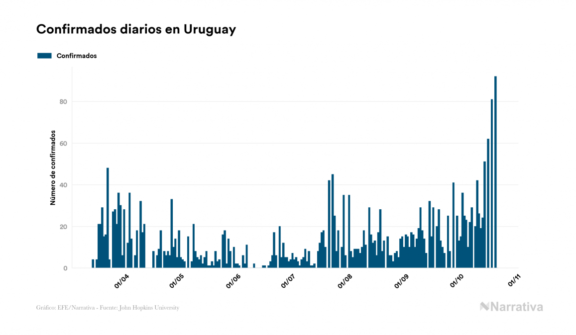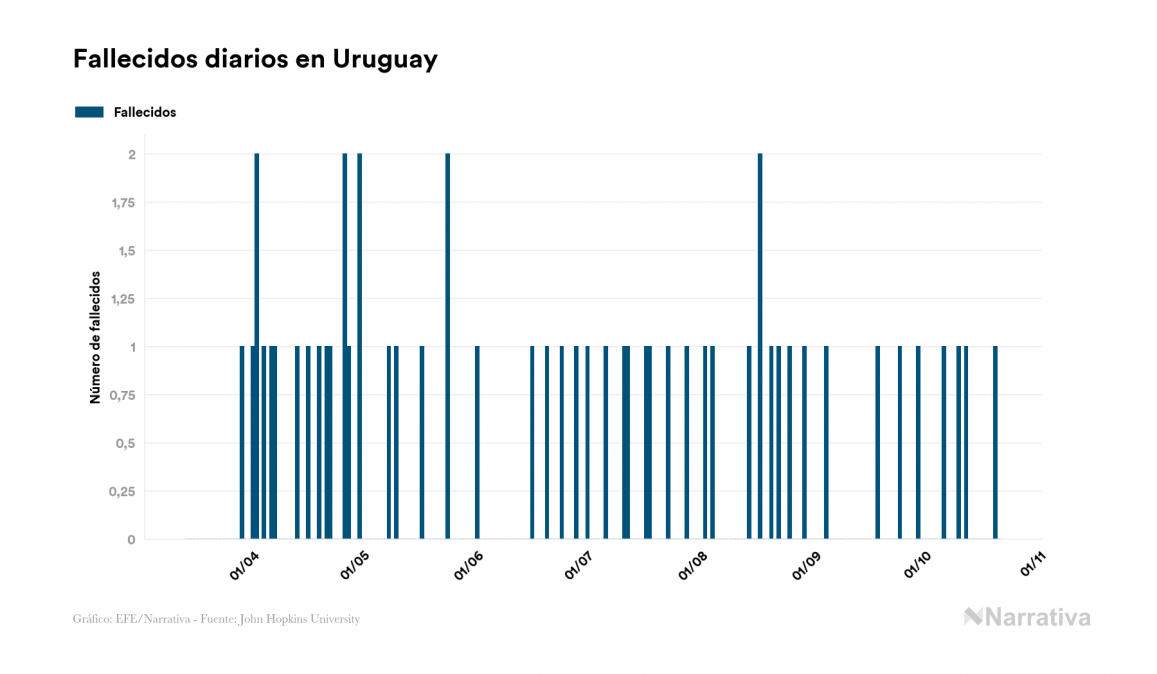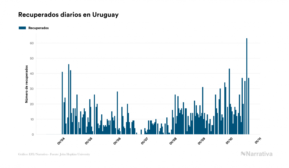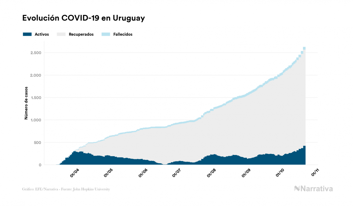 El nuevo coronavirus deja ya 2.623 casos de contagio en Uruguay, con 429 de ellos actualmente activos y 52 fallecidos, según los últimos datos correspondientes al 21 de octubre. Además, un total de 2.142 personas ya se ha recuperado desde que se produjo el primer contagio en el país.