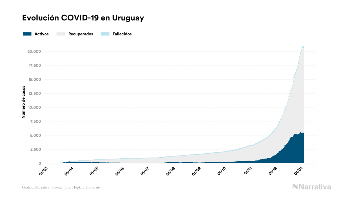 El coronavirus deja ya 20.823 casos de contagio en Uruguay, con 5.494 de ellos actualmente activos y 204 fallecidos, según los últimos datos correspondientes al 4 de enero. Además, un total de 15.125 personas ya se ha recuperado desde que se produjo el primer contagio en el país.