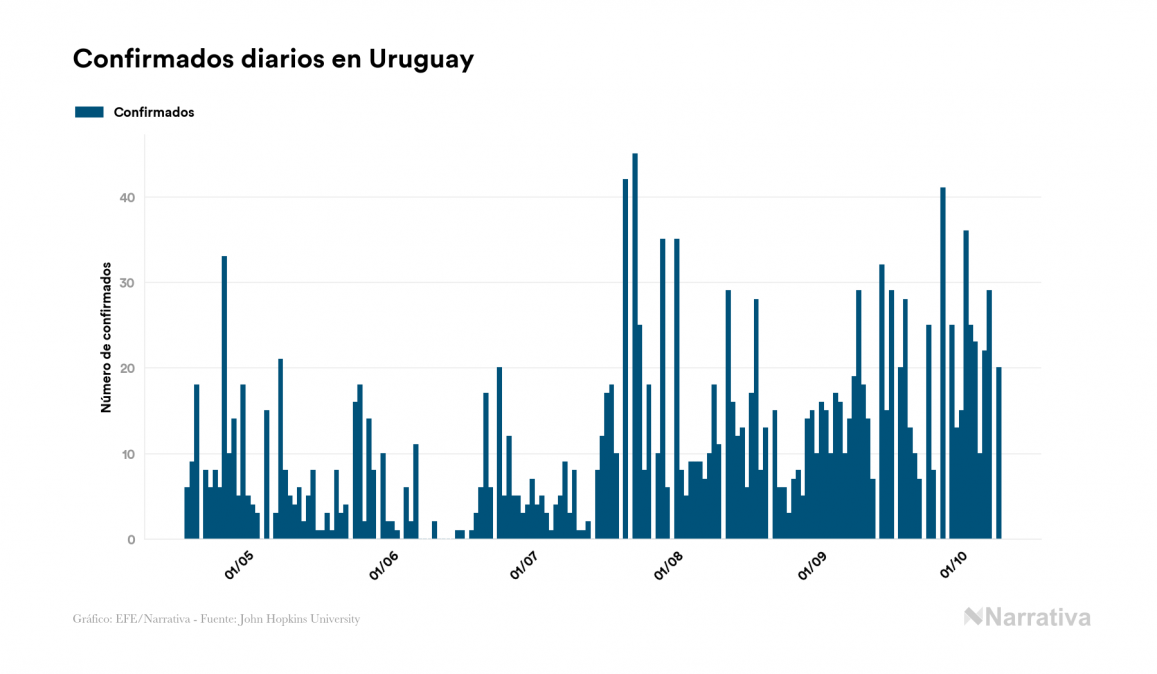 Según los últimos datos, actualmente en Uruguay hay 273 casos activos de coronavirus tras confirmarse 20 nuevos positivos y 14 altas médicas este viernes. Desde el comienzo de la pandemia, la cifra total de contagiados asciende a 2.226, con 1.904 recuperados y 49 fallecidos.